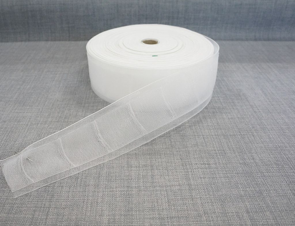 Detta veckbandet säljs per meter och är transparent. Sys fast på gardinerna om du önskar använda fingerkrokar. Kan även användas som kanal om man syr fast bandet upptill och nedtill och sedan lämnar kortsidorna öppna.