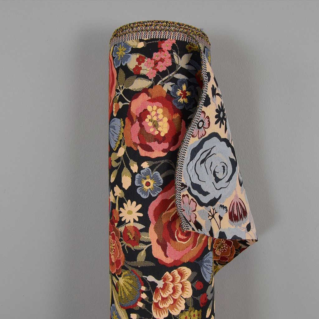 Ett exklusivt jacquardvävt möbeltyg med romantiskt blommönster. Perfekt för möbler, gardiner och dekorativa textilier. Slitstarkt och tidlöst med en Martindale på 18 000.