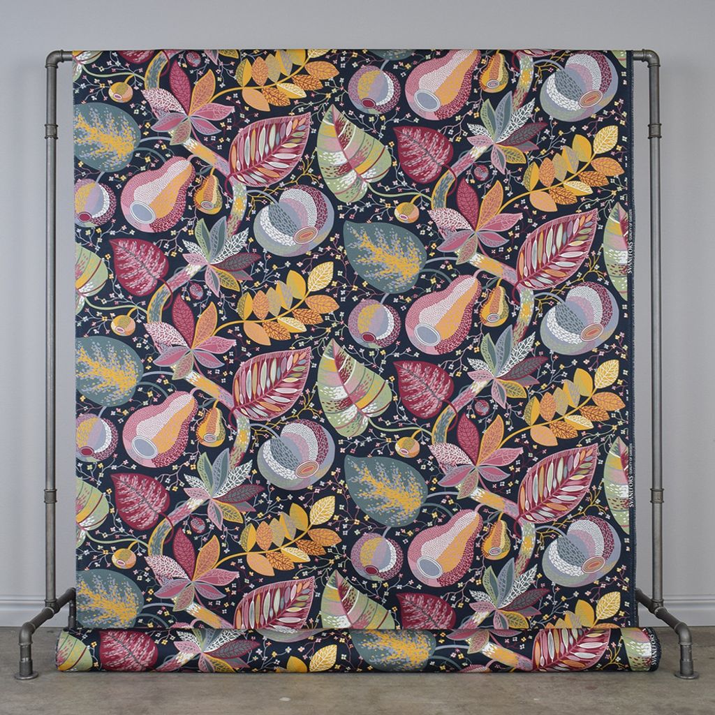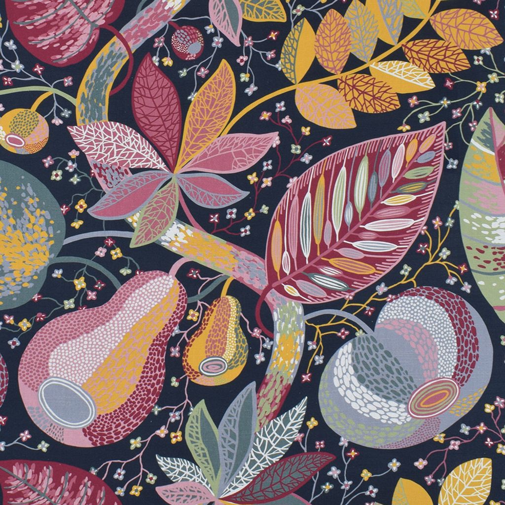 Mörkblå botten med färgglatt mönster av blommor, blad och frukt.