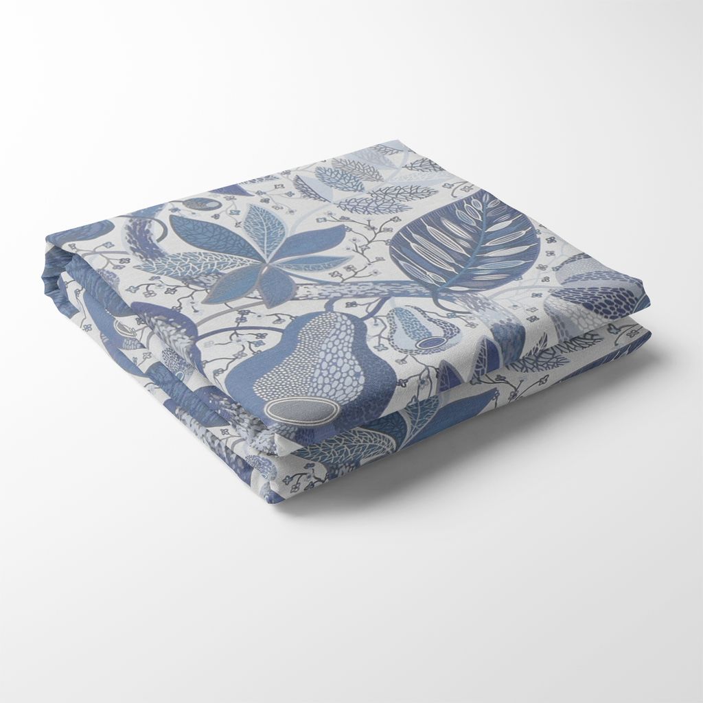 Bordsduk i populära Adam och Eva i blå toner från Svanefors. Den har ett fantastiskt bladmönster med vit botten med blått mönster av blommor, blad och frukt.