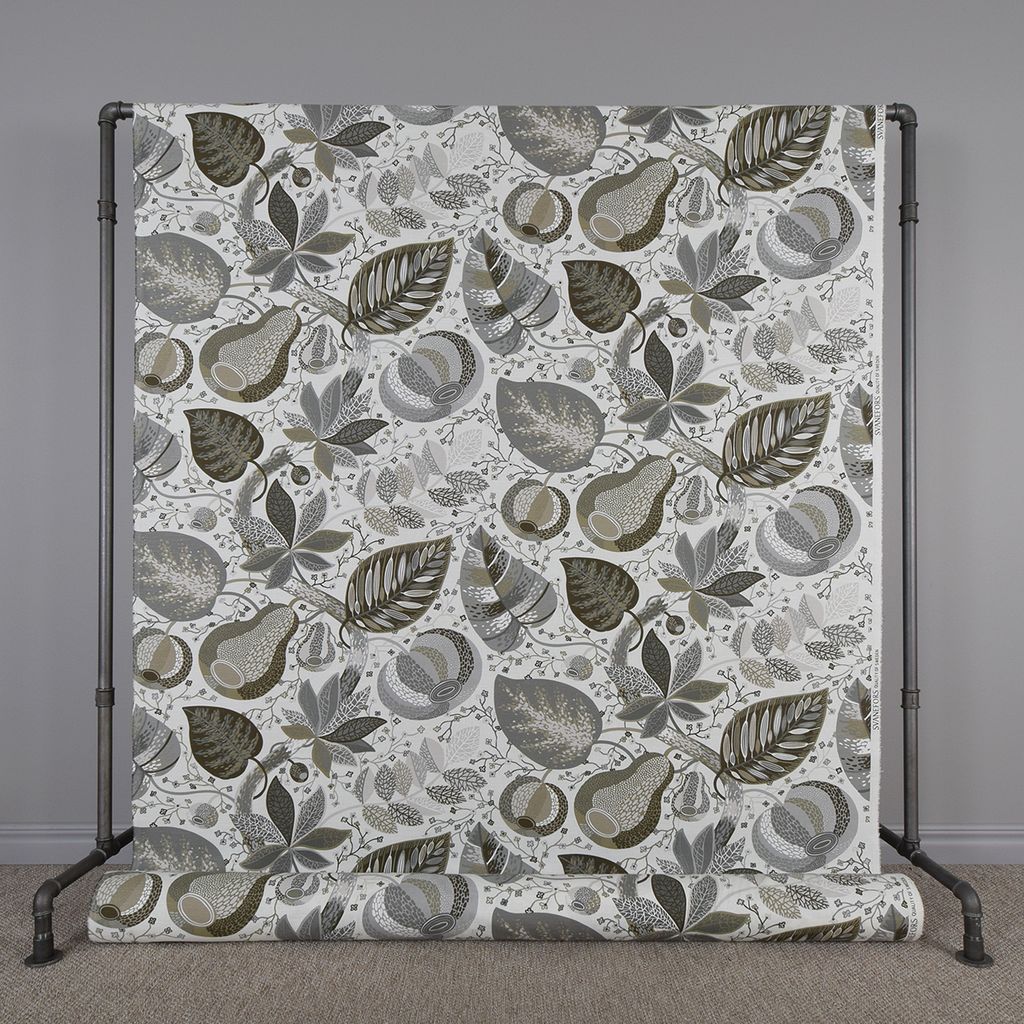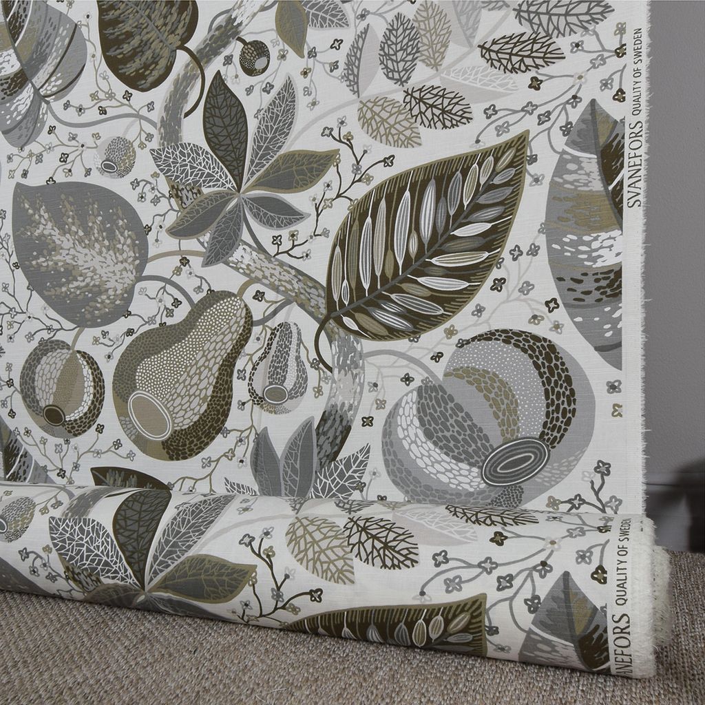 Detta bomullstyg är perfekt för gardiner, kuddar, dukar och andra dekorativa textilier. Med ett rikt och detaljerat mönster av löv och frukter i mossgröna och jordnära toner mot en ljus bakgrund, ger detta tyg en elegant och naturlig känsla till vilket rum som helst.