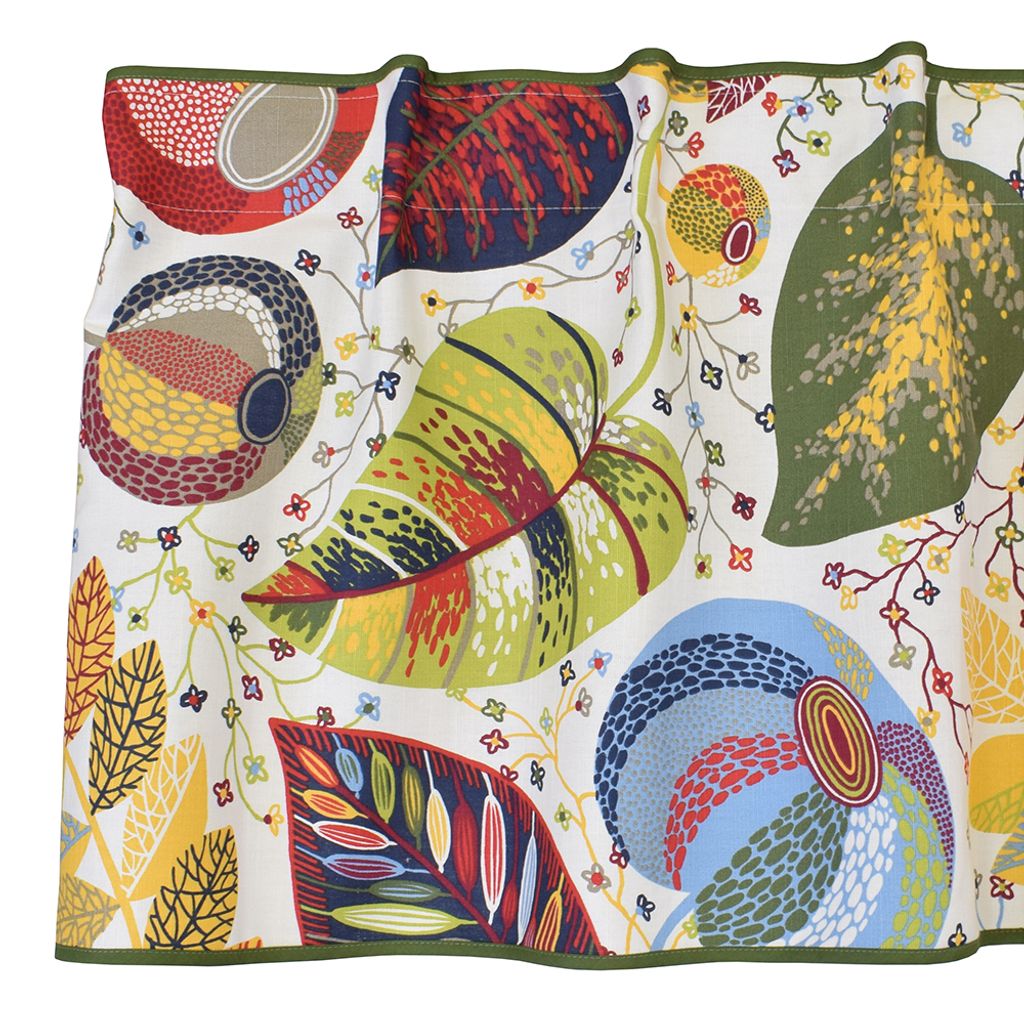 Adam & Eva multi gardinkappa, där naturens skönhet möter modern konst. Detta unika mönster med löv och frukter i en explosion av färger ger ditt hem ett fräscht och iögonfallande utseende. Med inspiration från naturens egna palett, passar denna gardinkappa perfekt för dem som vill skapa en personlig och levande inredning.