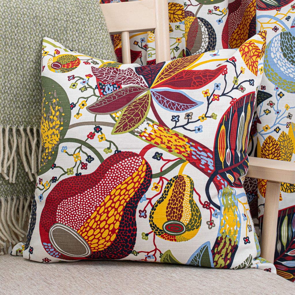 Ett rikt, detaljerat mönster av löv och frukter i levande färger som rött, blått, grönt och gult, på en ljus botten vilket ger en härlig mix av liv och energi till din inredning.