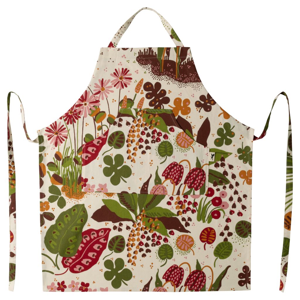 Förkläde sytt i tyg med fin kvalité. Ficka mitt fram och Reglerbart nackband. Tyget har ett härligt blommönster på en cremefärgad botten som visar spår av sjuttiotalets och mönstret är skapat av Louise Fougstedt-Carling.