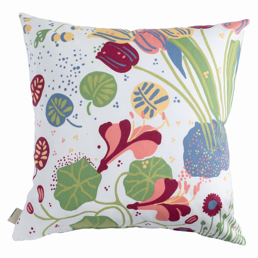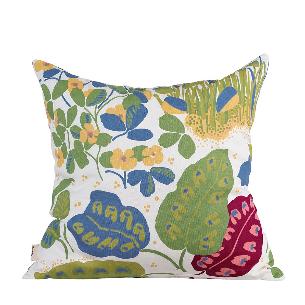 Ailanthus vit-multi kuddfodral är en dekorativ inredningsdetalj med rötter i 1970-talets formspråk, designad av Louise Fougstedt-Carling. Mönstret, vars namn betyder gudaträd, kännetecknas av slingrande växtformer, blad och blomster i ljusa och lekfulla färgkombinationer som skapar en levande och inbjudande känsla i rummet.