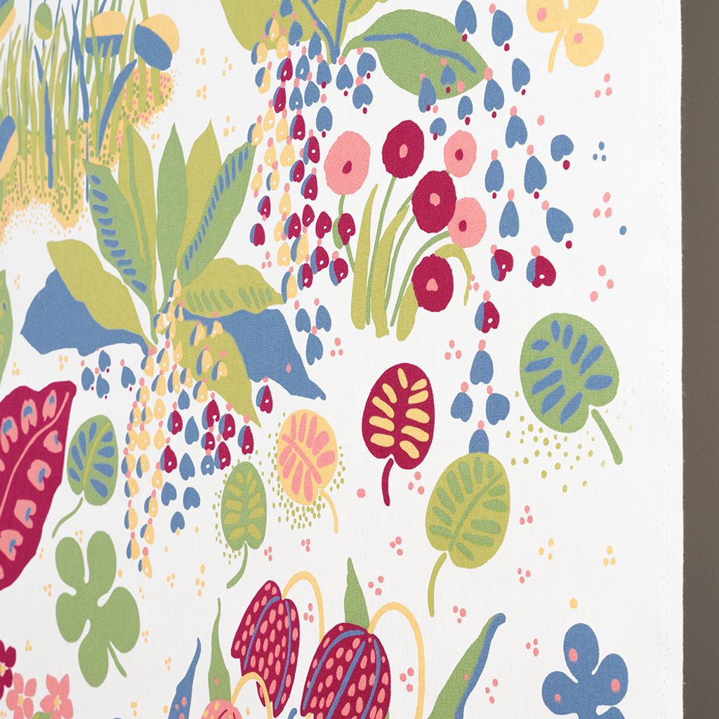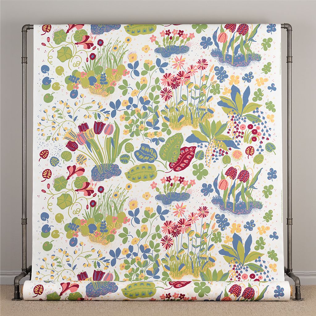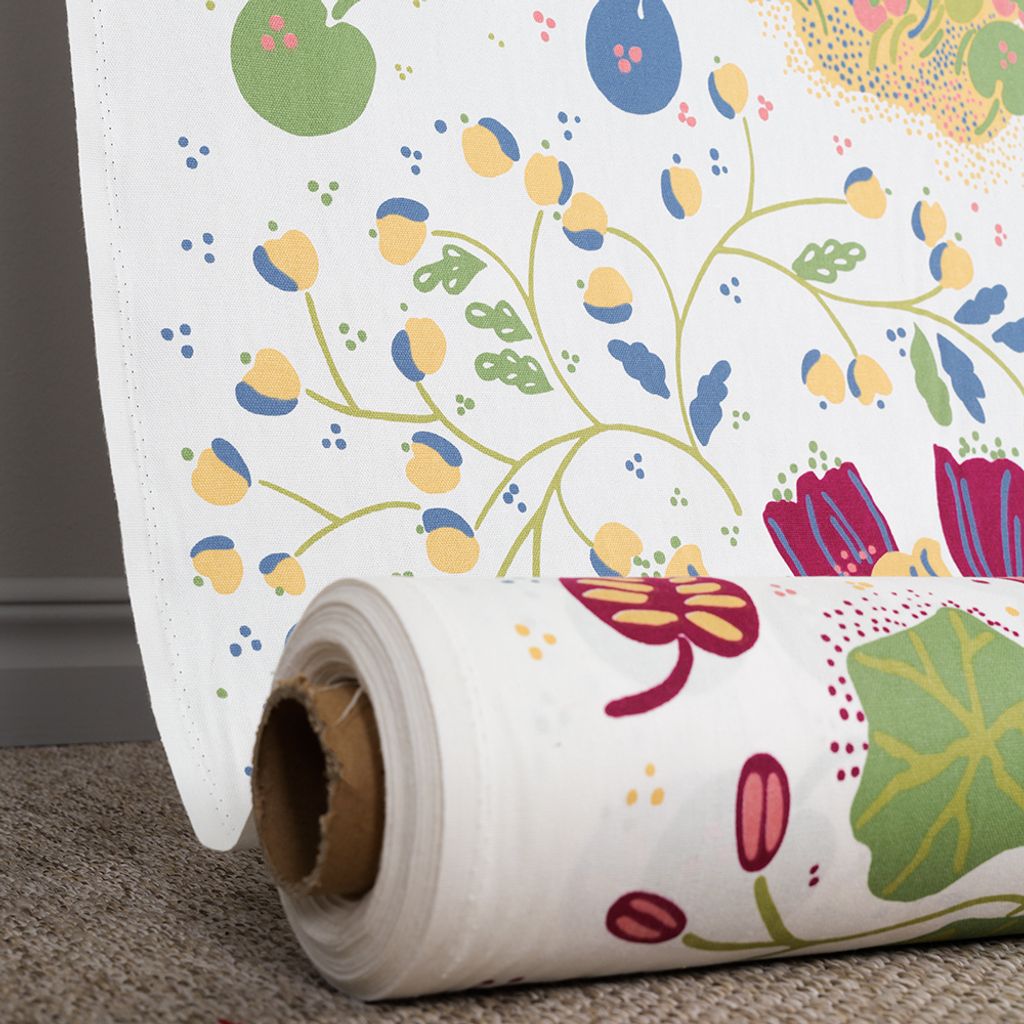 Ailanthus vit-multi är ett tidlöst och dekorativt bomullstyg som ger liv och karaktär till ditt hem. Mönstret, designat av Louise Fougstedt-Carling på 1970-talet, är inspirerat av naturens frodighet och består av slingrande växtformer, blad och blomster i ljusa, harmoniska färger.