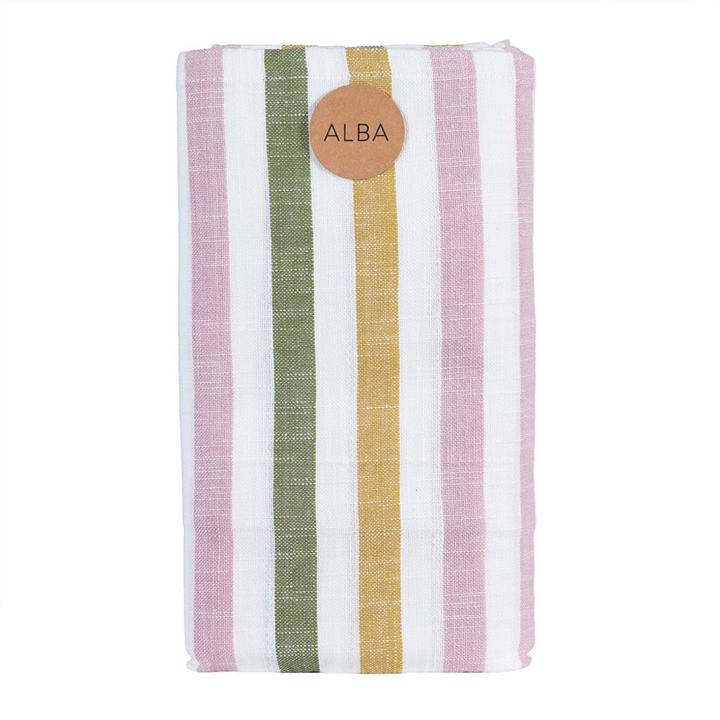 Alba randig bordsduk är en ljus och fräsch duk med mjuka ränder i rosa, grönt, gult och vitt. En stilren och tidlös design som skapar en inbjudande och harmonisk känsla runt matbordet.
