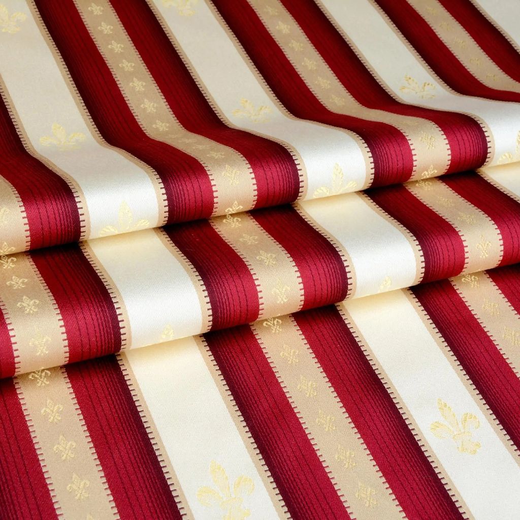 Alexandria vinröd är ett exklusivt jacquardvävt stiltyg framtaget för möbelklädsel samt sömnad av gardiner och andra inredningsdetaljer. Det klassiska randmönstret kombineras med dekorativa fleur-de-lys-motiv, vilket ger tyget en sofistikerad och tidlös karaktär.