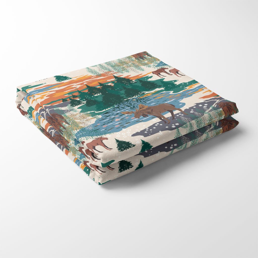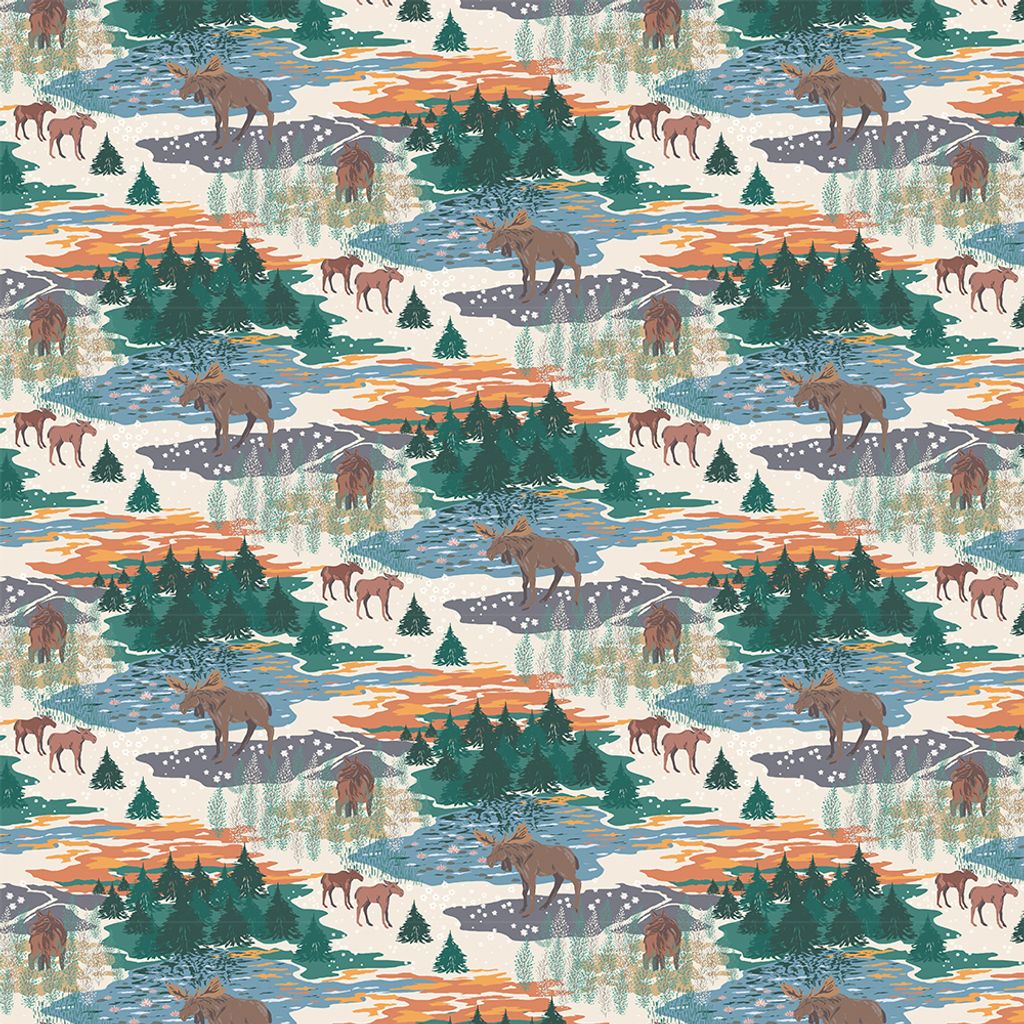 Bordsduken Älgrike beige förmedlar en stillsam berättelse om den svenska skogens själ – en plats där naturen står i centrum och älgarna majestätiskt rör sig genom landskapet. Mönstret är rikt på detaljer med vintriga tallar, snöflingor som faller, spegelblanka sjöar och varma nyanser av orange, blått och grönt mot en mild beige botten. Kombinationen av färger och motiv skapar ett harmoniskt uttryck som passar lika bra till vardag som till säsongens högtider.