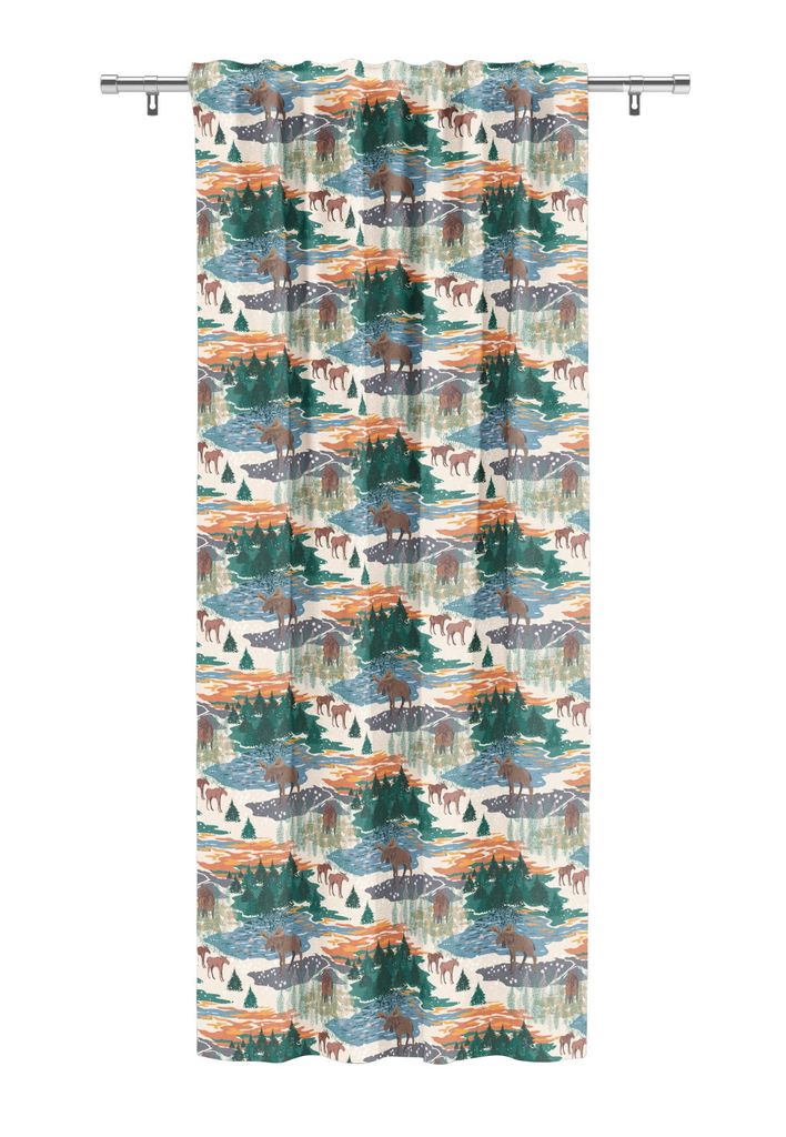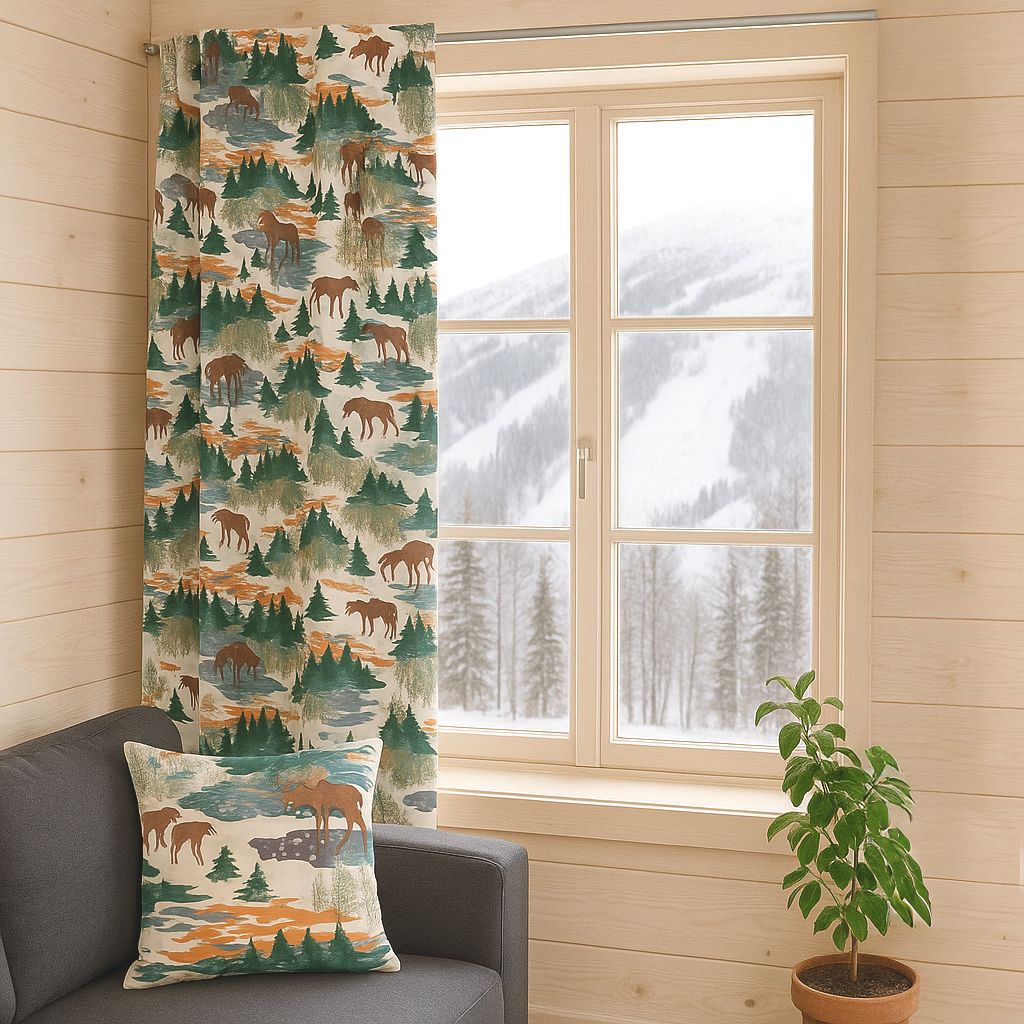 Låt naturen flytta in i ditt hem med gardinen Älgrike i beige – ett livfullt tyg med älgar, fjällskog och fjällbäckar i akvarellstil, perfekt för stugan, fritidshuset eller hemmets mysigaste vrår.