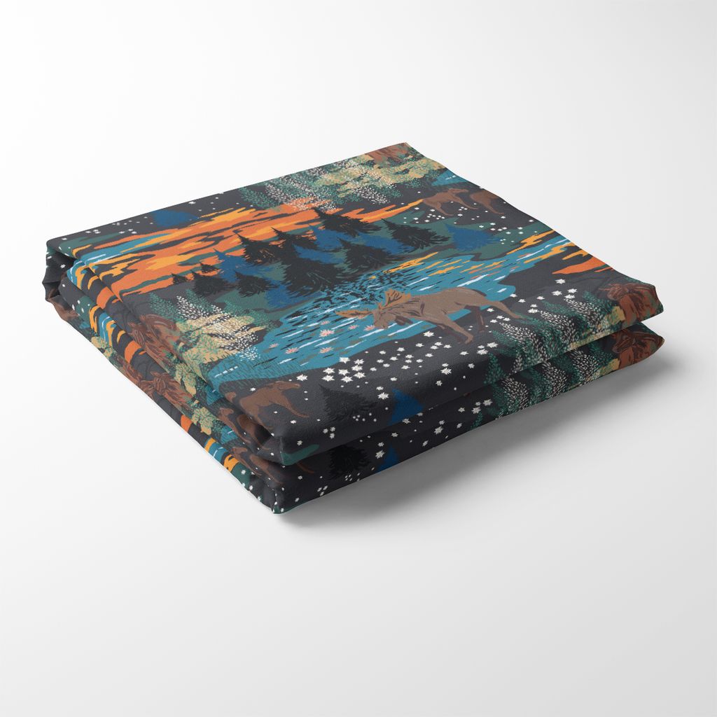 Låt naturen flytta in med vår bordsduk Älgrike brun – en hyllning till den nordiska vildmarken. Mönstret fångar ett fridfullt ögonblick i skogens djup, där älgar rör sig genom ett landskap med granar, fjäll, sjöar och fallande snöflingor. Den levande färgpaletten – dämpade bruna nyanser i kombination med skymningsblått, skogsgrönt och varma orange toner – skapar en känsla av mystik och stillhet.