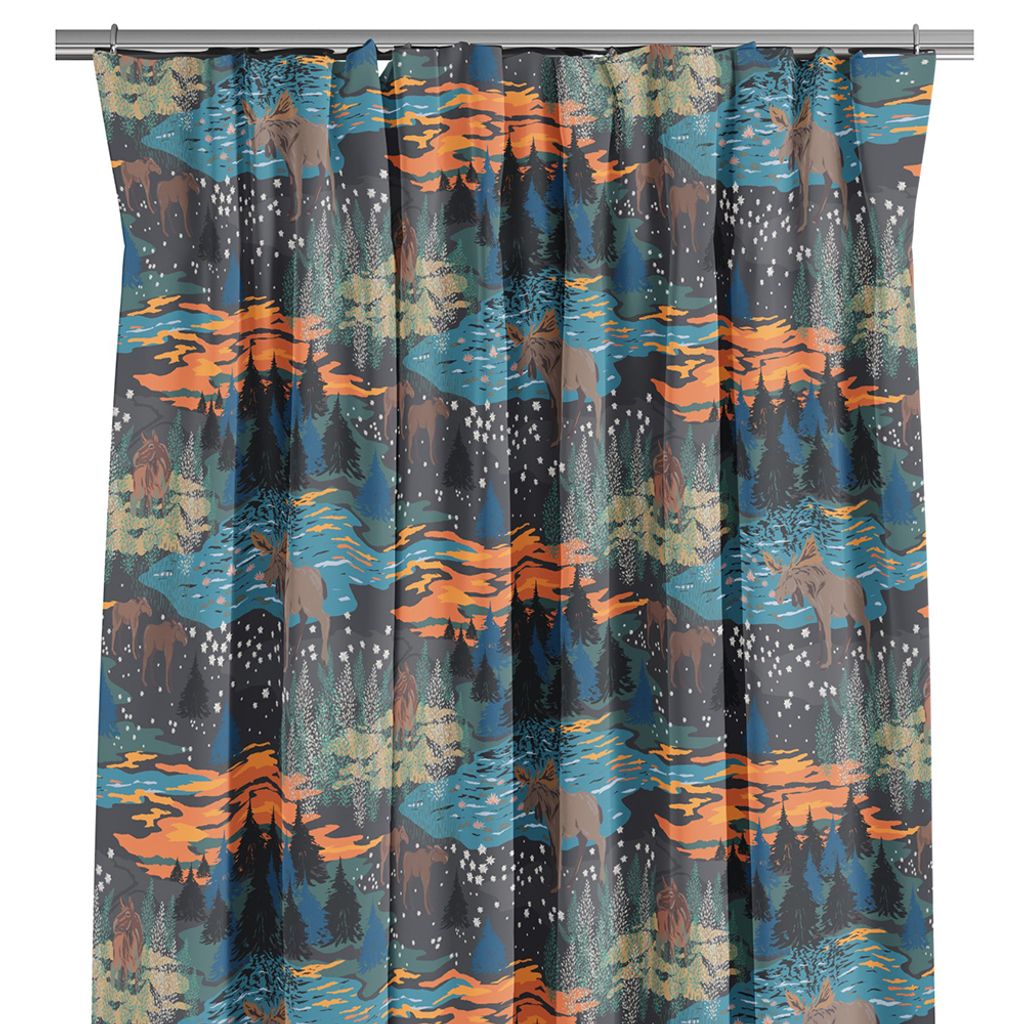 Trycket är rikt detaljerat med silhuetter av träd, snöflingor och majestätiska älgar som ger gardinen ett livfullt och sagolikt uttryck. Den passar utmärkt i fjällstugan, lantköket eller det moderna hemmet som längtar efter ett stycke natur. Gardinen är tillverkad i en mjuk och slitstark bomullsblandning, med ett fint fall och en tät väv som ger både insynsskydd och rumsstruktur.
