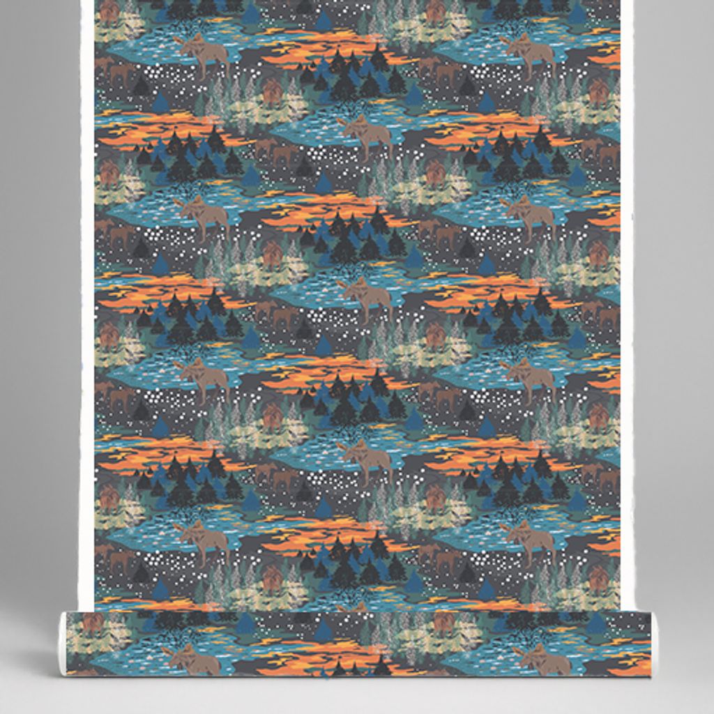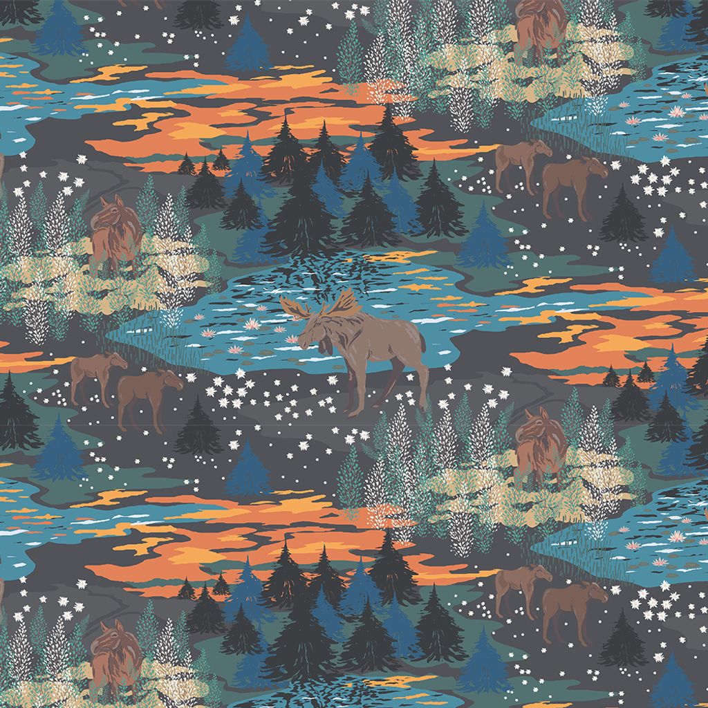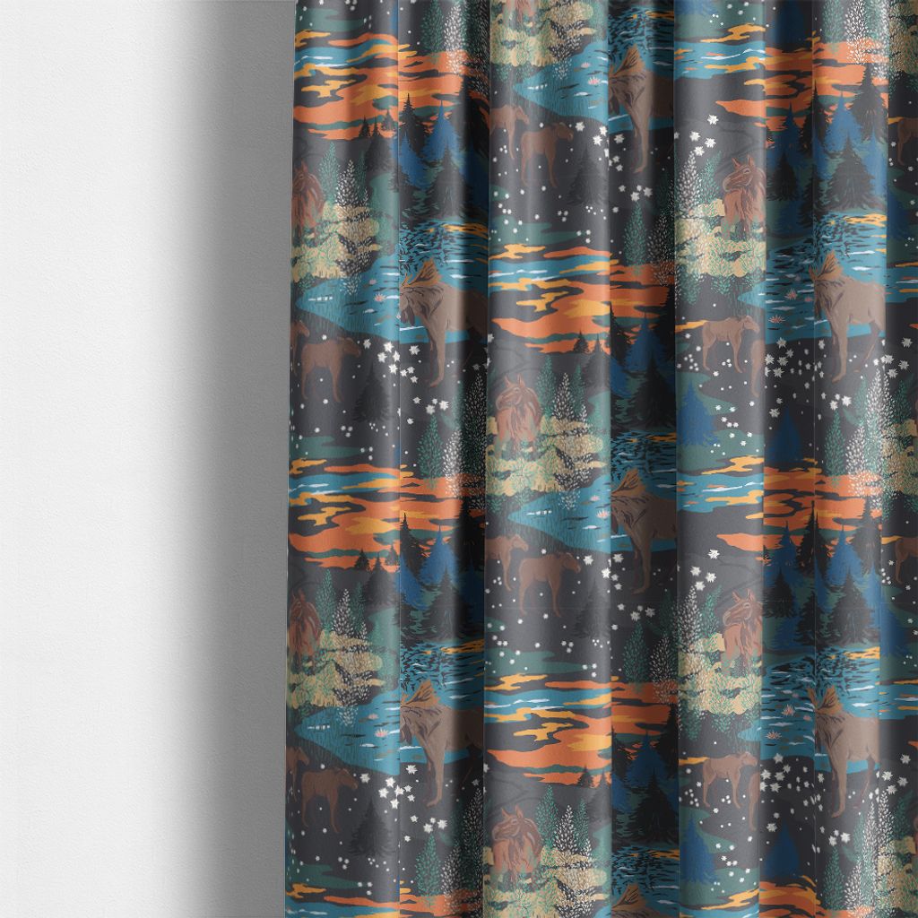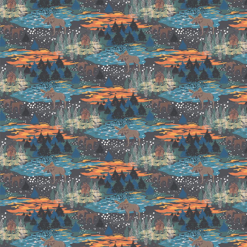 Tyg med älgar och skog i brun, blågrön och orange färgskala. Design Louise Videlyck för Arvidssons – ett stämningsfullt val till hemmet.