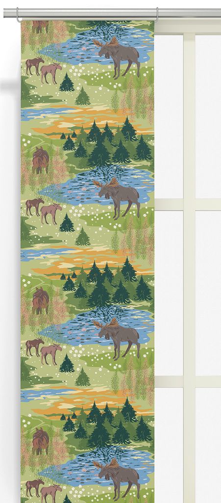 Älgrike grön panelgardin bjuder in till en ljus och harmonisk tolkning av den svenska naturen. Mönstret visar älgar och kalvar vid en stilla sjö, omgivna av granar, näckrosor och grönskande växtlighet. De mjuka färgerna i grönt, blått, brunt och varmt orange fångar känslan av en solig sommarkväll i skogen – där naturen är som mest levande.