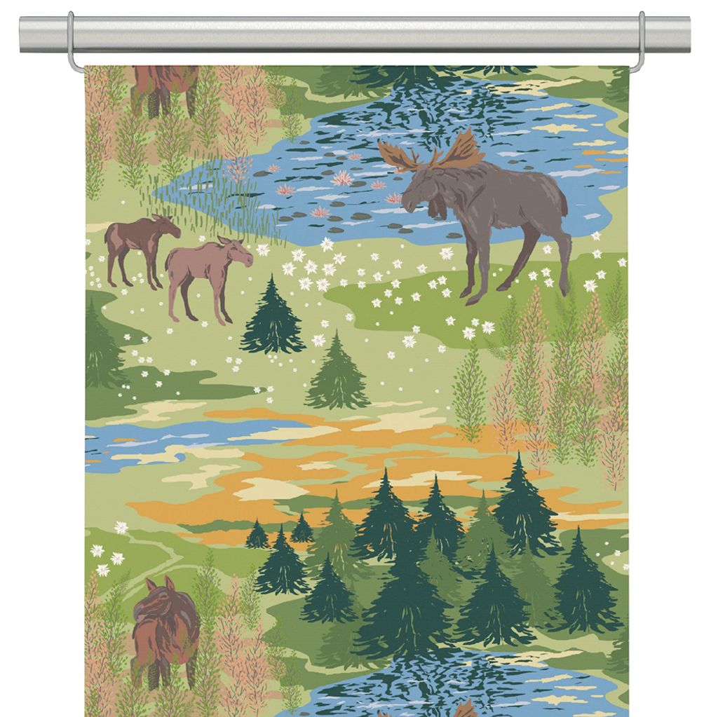 Älgrike grön panelgardiner fångar den ljusa sidan av den nordiska naturen – ett rofyllt mönster med älgar, kalvar och skogssjöar i gröna och blå toner. En vacker gardin som skapar lugn och naturkänsla i hemmet.