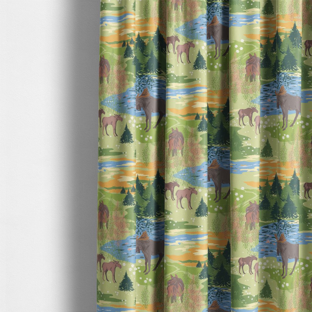 Grön metervara med älgar och skogsmotiv – lugnt och levande tyg för gardiner och heminredning. Design Louise Videlyck.