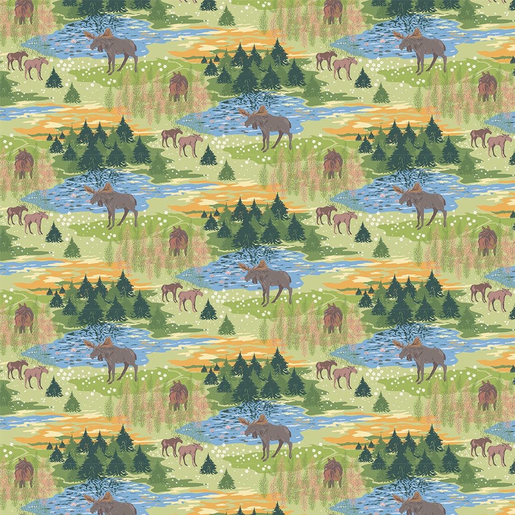 Metervara i bomull med älgar och skog i gröna och blå nyanser. Design Louise Videlyck för Arvidssons – perfekt för gardiner och dukar.