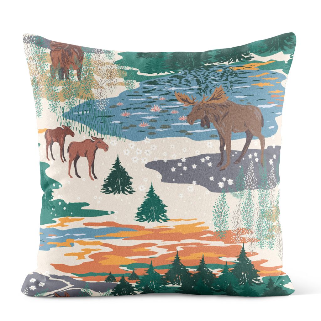 Kuddfodral i beige bomull med älgar, skog och fjällmotiv. Designat av Louise Videlyck för Arvidssons Textil – perfekt för en naturnära känsla.