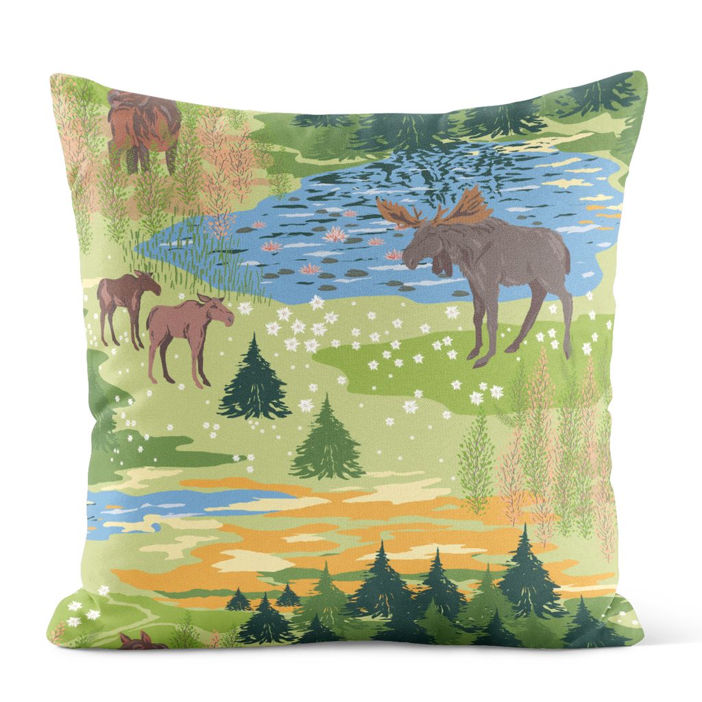 Älgrike – Kuddfodral Grön är ett livfullt inslag i hemmet för dig som älskar naturen. Det färgstarka motivet med älgar, skog, fjäll och vatten är skapat av Louise Videlyck och tryckt på 100 % bomull.