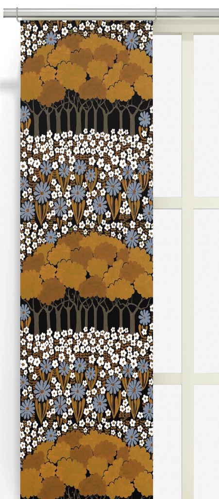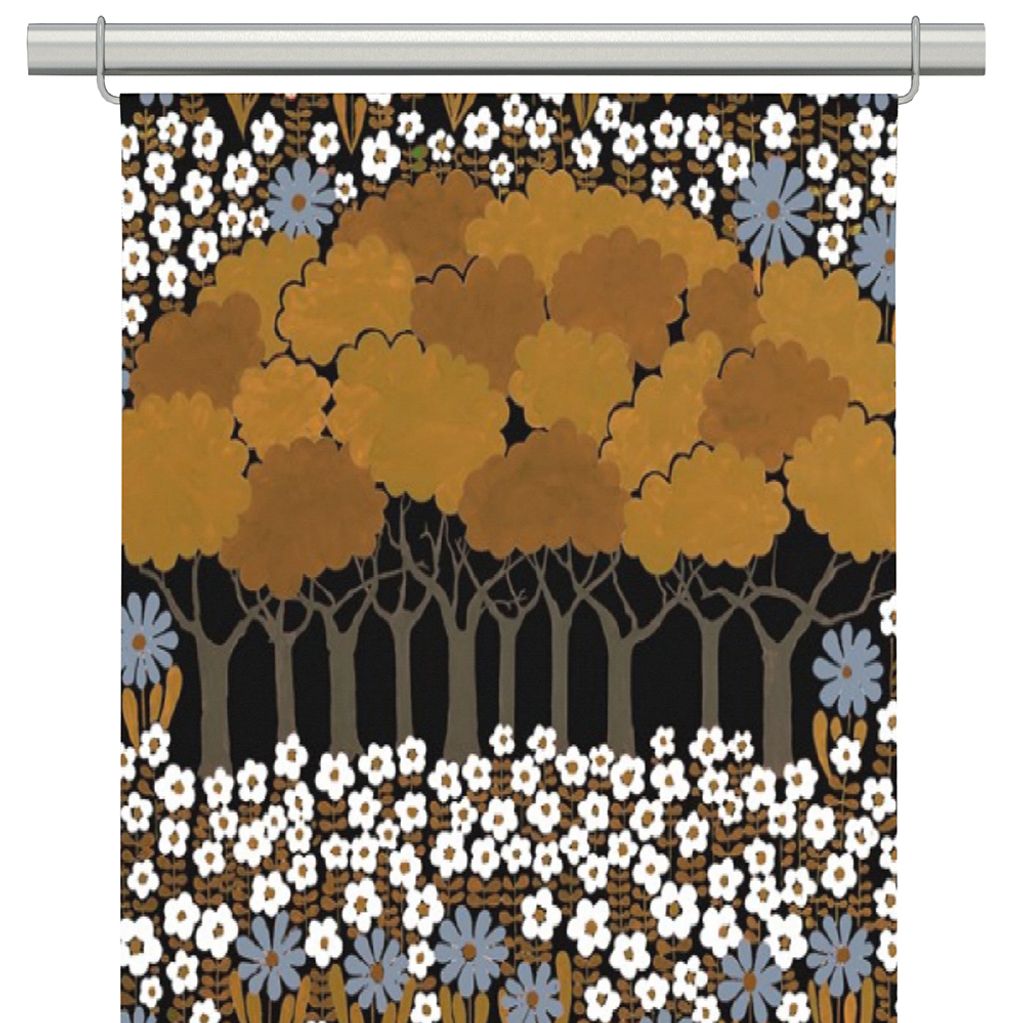 Snygga motivet Allé med mönster av träd och blommor i retro stil och färg. Från Arvidssons textil. Ofållad nederkant med overlocksöm