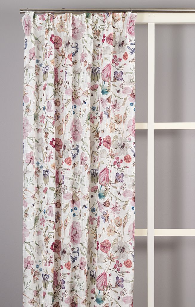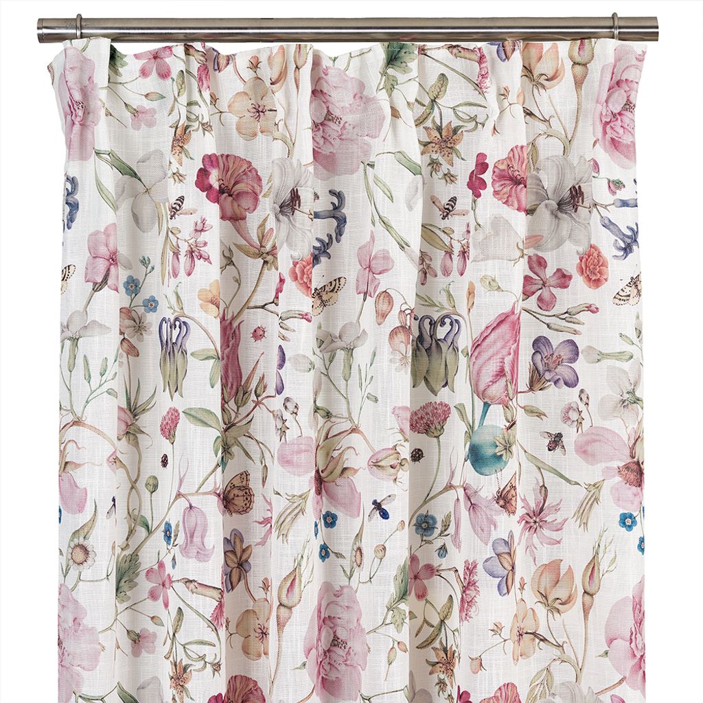 Alma offwhite gardiner bjuder på ett uttryck som är både romantiskt och elegant. Den kraftigare strukturen ger ett vackert fall och en följsam känsla, medan det storblommiga mönstret – fyllt av pioner, fjärilar, bin och sommarblommor – ger ett levande och färgrikt intryck. Varje detalj är illustrerad i akvarellstil på en ljus botten, vilket skapar en nästan poetisk stämning i rummet.