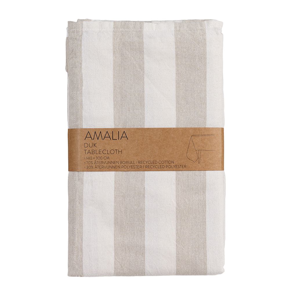 Amalia beige bordsduk 140x300cm är en stilren randig duk i återvunnet material med en naturlig och tidlös känsla. En elegant duk som passar lika bra till vardag som till fest.