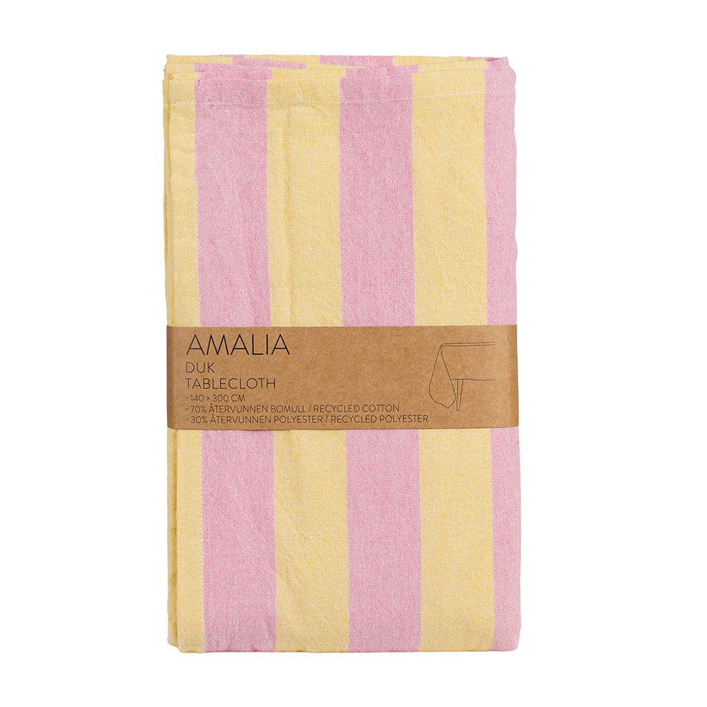 Amalia gul-rosa bordsduk är en randig duk i återvunnet material med mjuka färgtoner i gult och rosa. En lekfull men stilren duk som ger dukningen ett ljust och personligt uttryck.