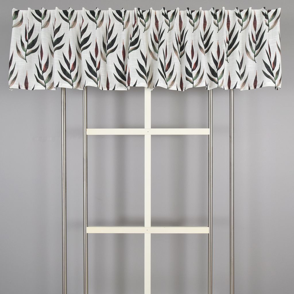 Skapa en lugn och inbjudande atmosfär i ditt hem med Amaya gardinkappa 45x250 cm. Den här gardinkappan har ett vackert tryckt mönster av stiliserade blad i jordnära färger som grönt, vinrött och svart mot en ljus botten, vilket ger en fin kontrast utan att bli för dominant.