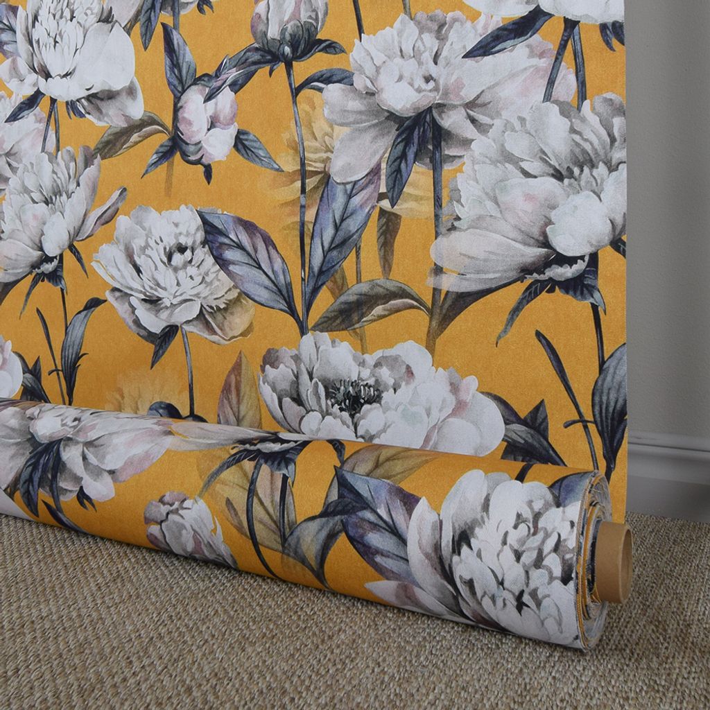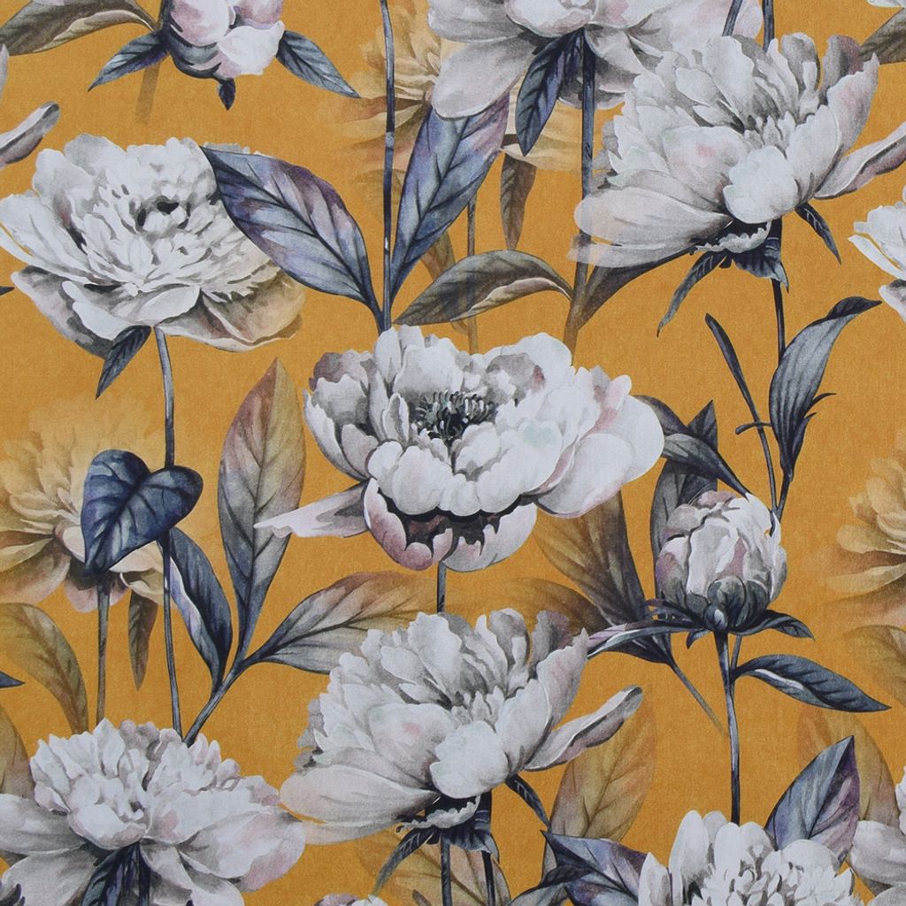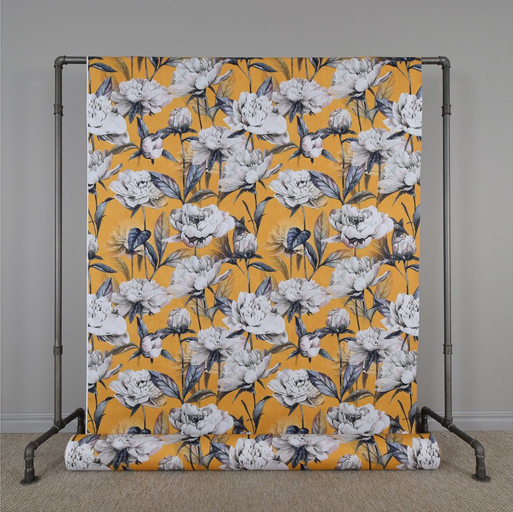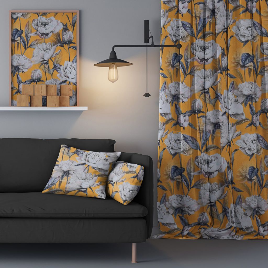 Stormönstrat gardintyg med stora vita blommor på ockra gul botten.