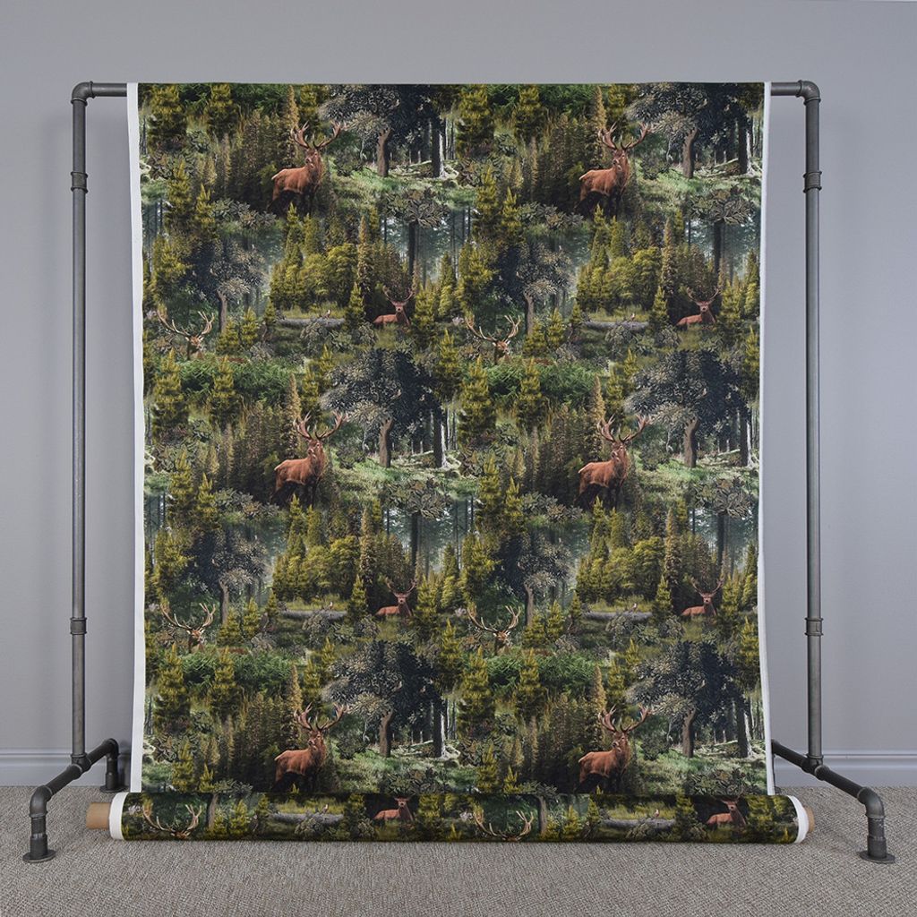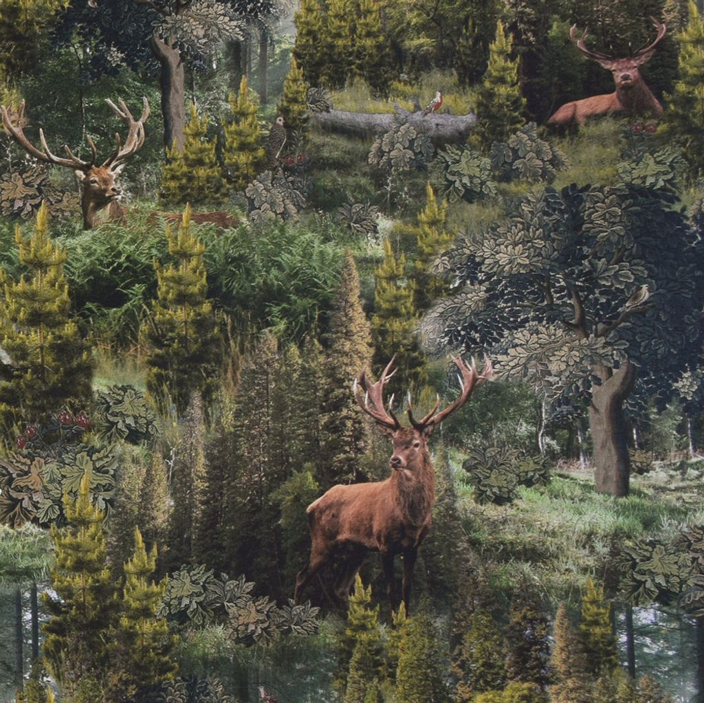 Tyg för gardiner och inredning med ett underbart mönster med kronhjort i skogsmiljö.