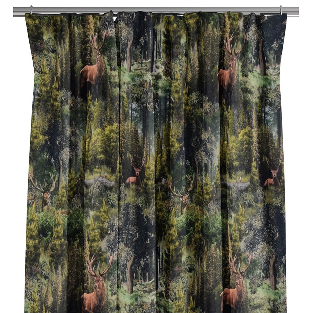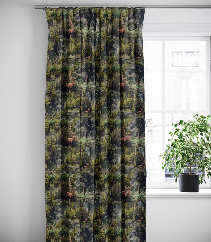 Gröna gardiner med ett mönster av kronhjort i skogen.