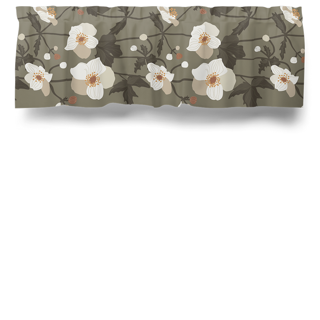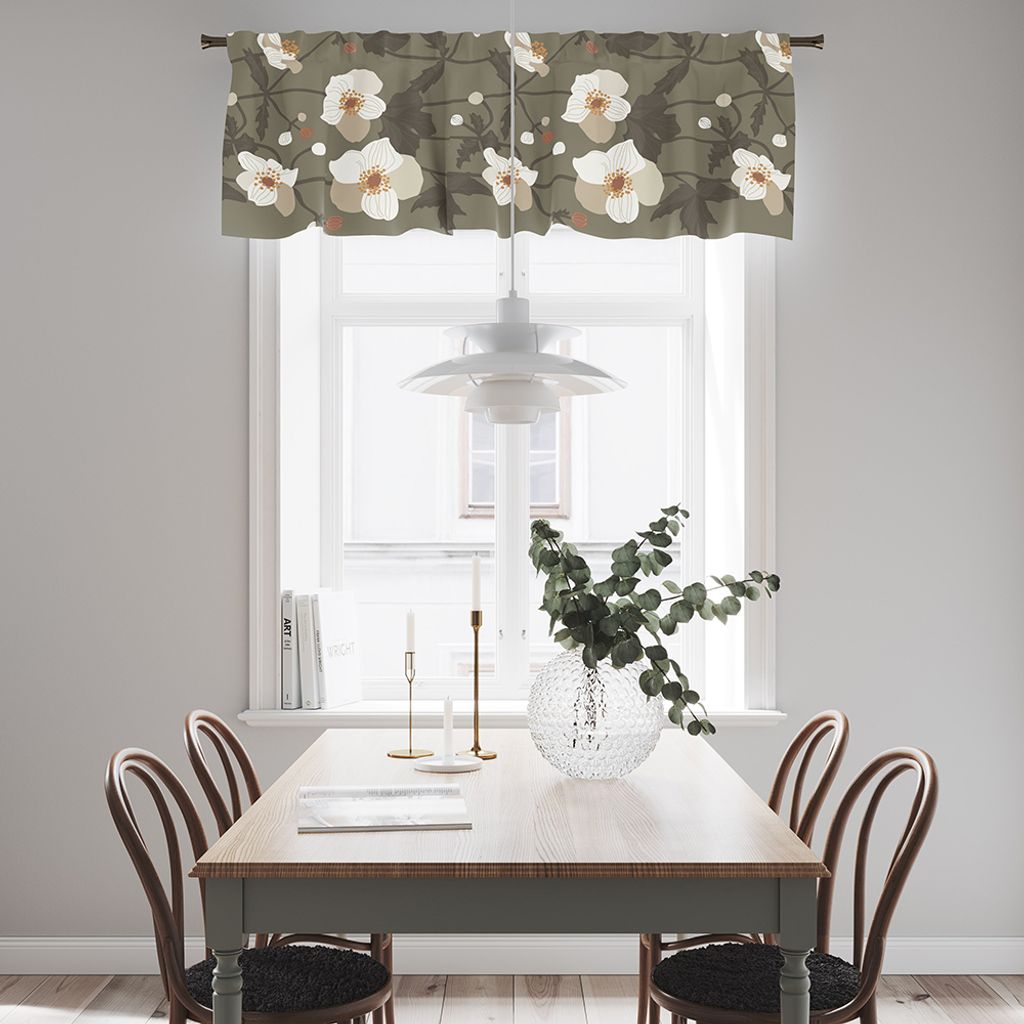 Anemon grön gardinkappa ett tryck med gröna blad och de små, subtila knoppar och blommor i vitt som kompletterar mönstret och skapar en harmonisk balans.