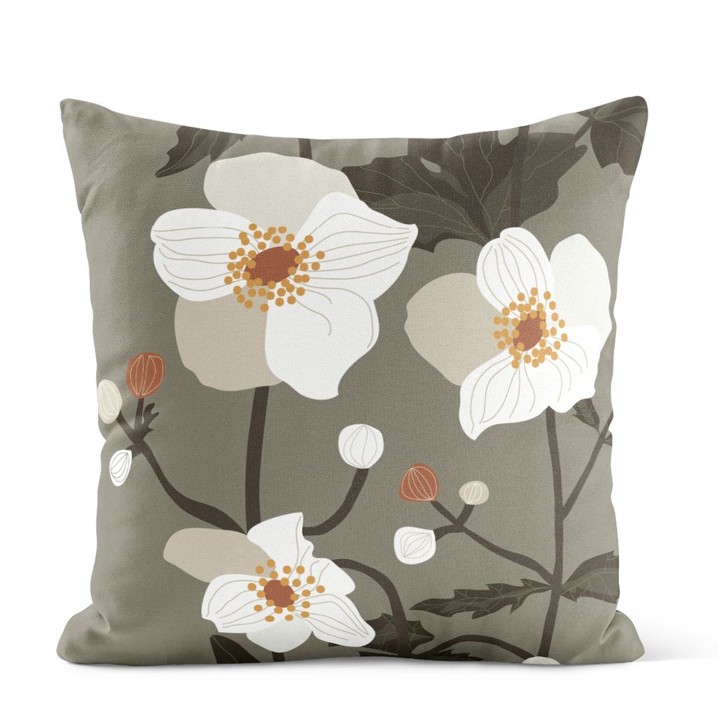 Anemon grön kuddfodral med vackra, stilrena anemonblommor mot en mjukt grön bakgrund, perfekt för att skapa en naturlig och harmonisk atmosfär i ditt hem.