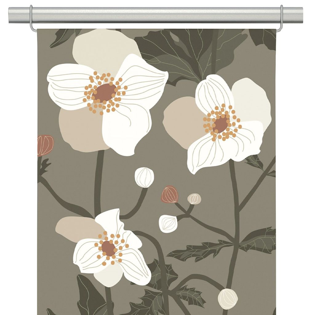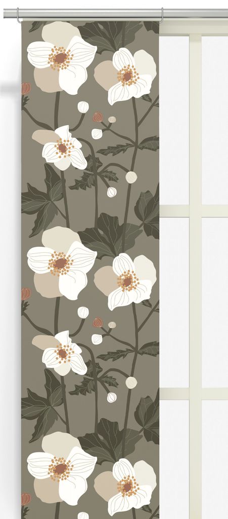Panelgardin Anemon grön har mörkgröna blad och de små, subtila knoppar och blommor i vitt som kompletterar mönstre på en grön bakgrund.
