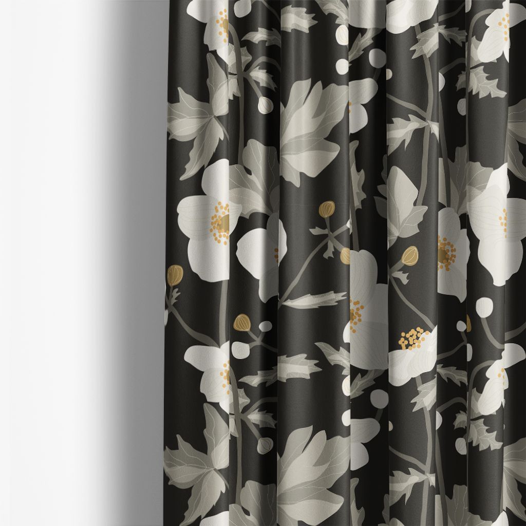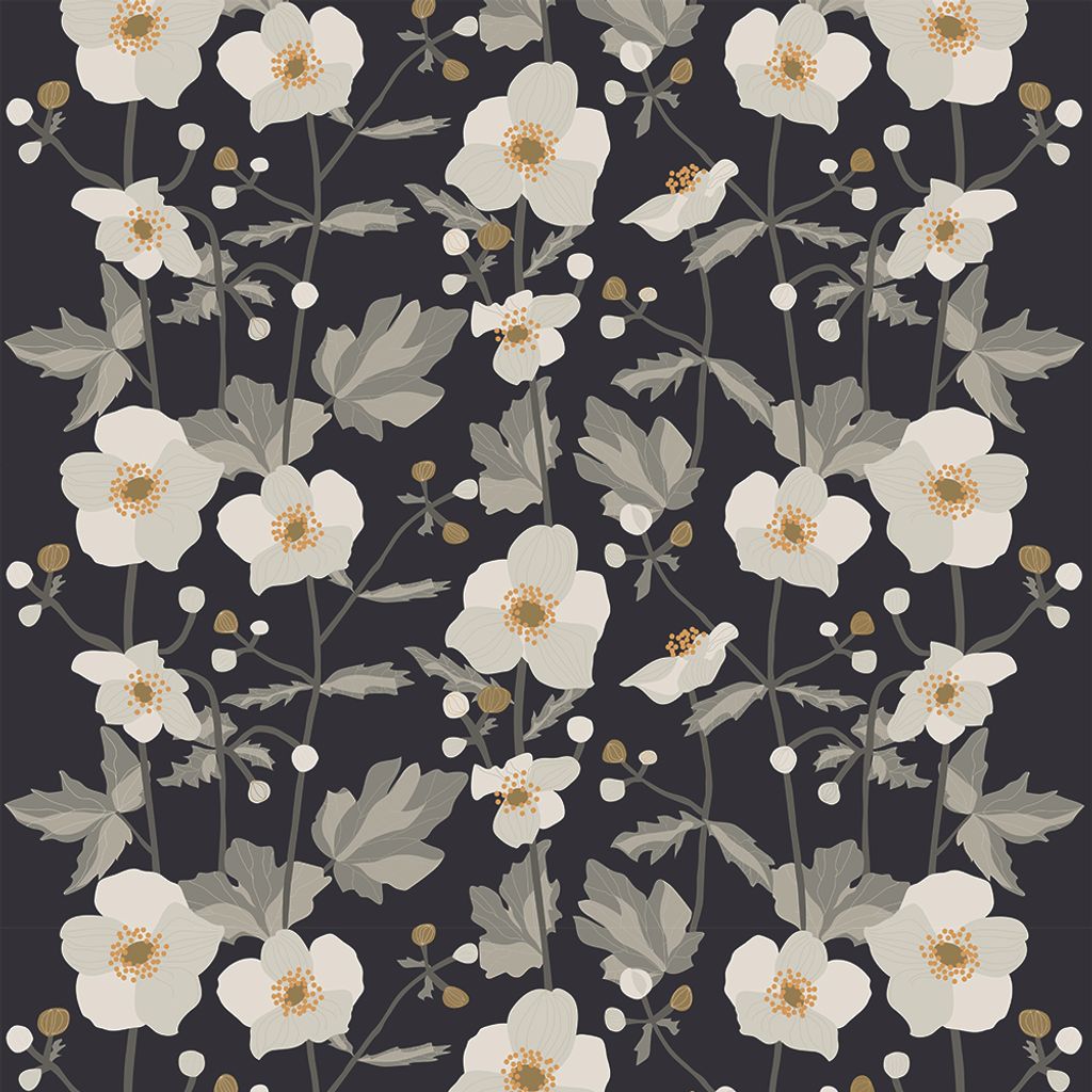 Anemon mörkgrå är ett vackert och romantiskt mönster som fångar essensen av blommande anemoner. Tyget har en mörk bakgrund och då framhävs de vita blommorna, som har detaljerade gula mittpunkter.