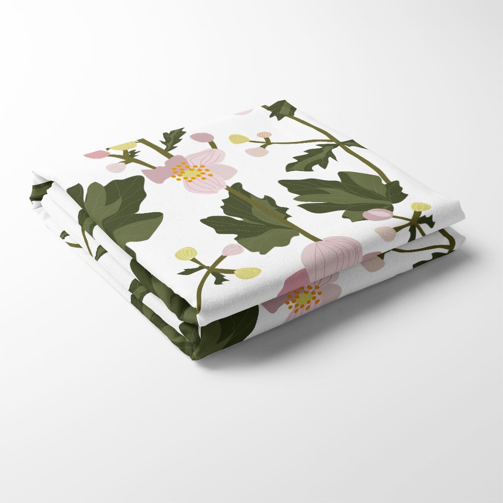 Storblommig bordsduk i tyget Anemon rosa, rosa blommor och gröna blad tryckt på ett vitt tyg