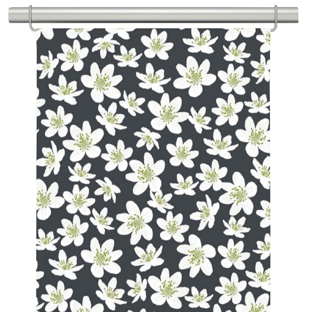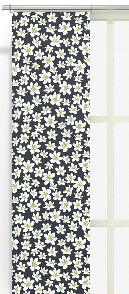 2-pack panelgardiner med mörkgrå botten och små vita och limegröna anemone blommor från Arvidssons textil