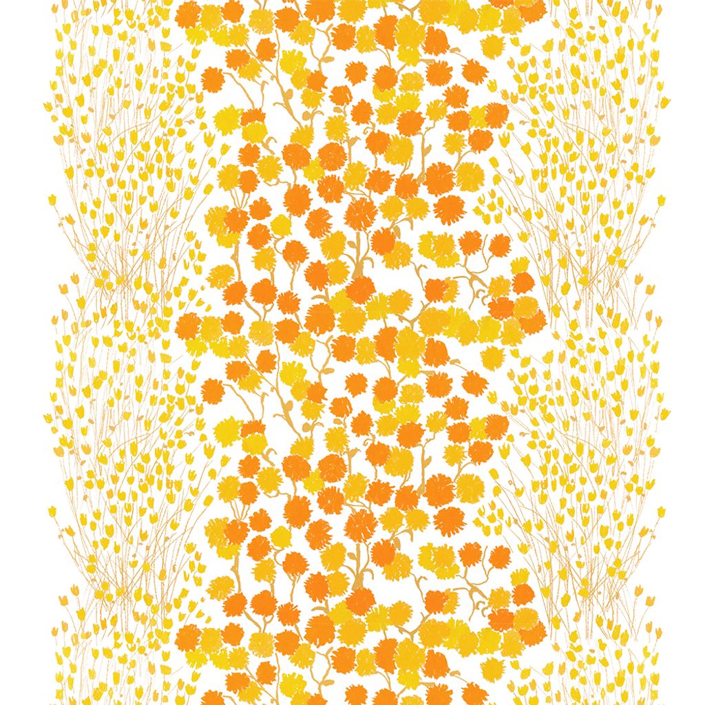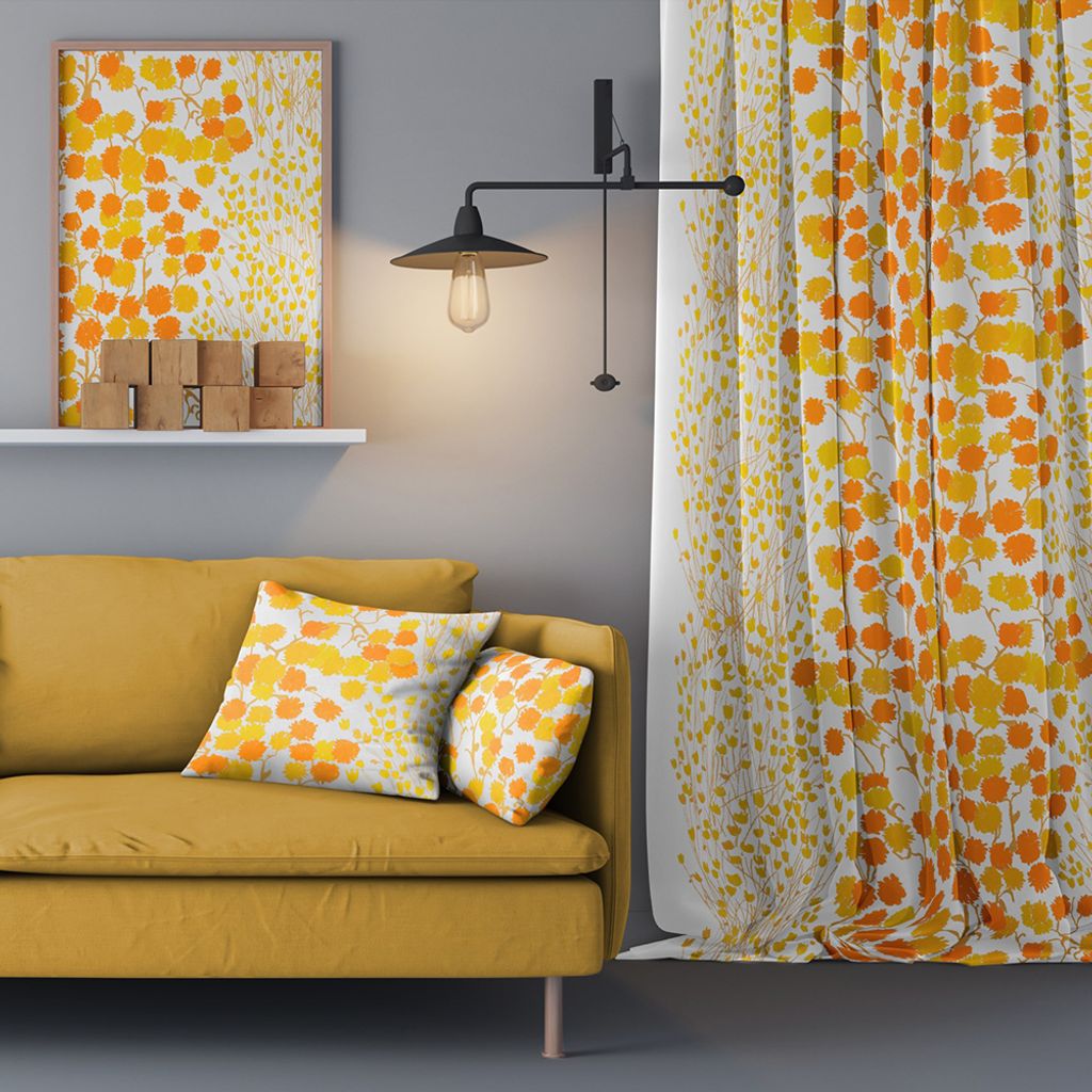 Tyget Ängen gult och orange mönster av blommor, gör sig bra till gardiner, kuddar, duk, väskor m.m.