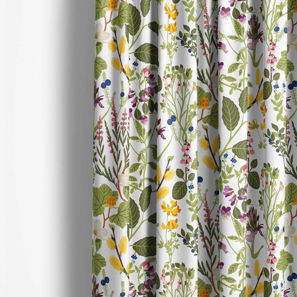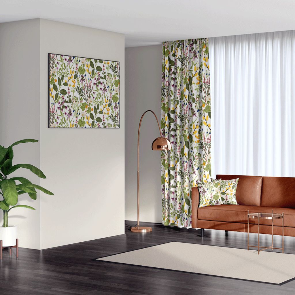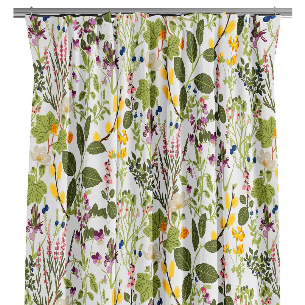 Blommiga gardiner med Tyget Ångermanland, inspirerat av naturens rikedom, visar ett frodigt och detaljerat mönster av vilda blommor och blad, perfekt fångat i en livfull färgpalett. Tyget har en vit bakgrund som gör att mönstret framträder fint, blommor i nyanser av lila, gult, orange och grönt.