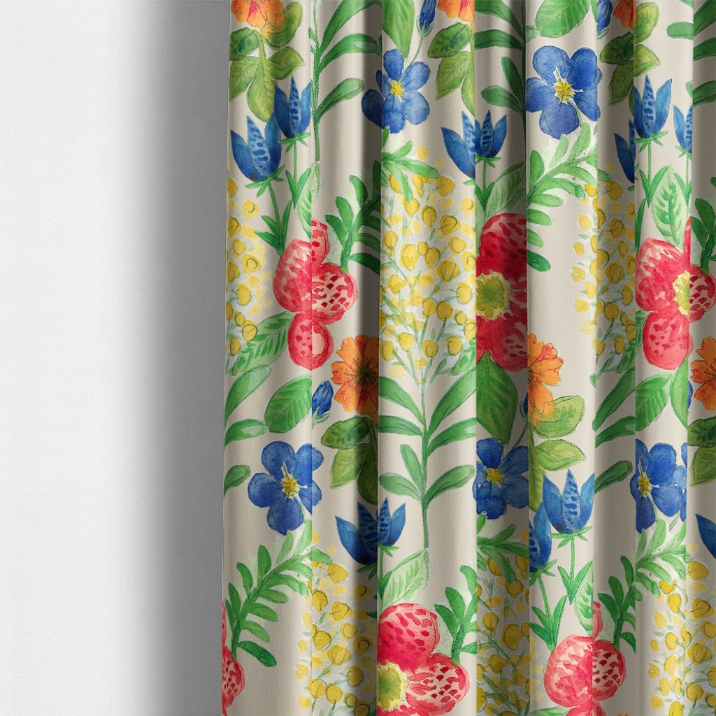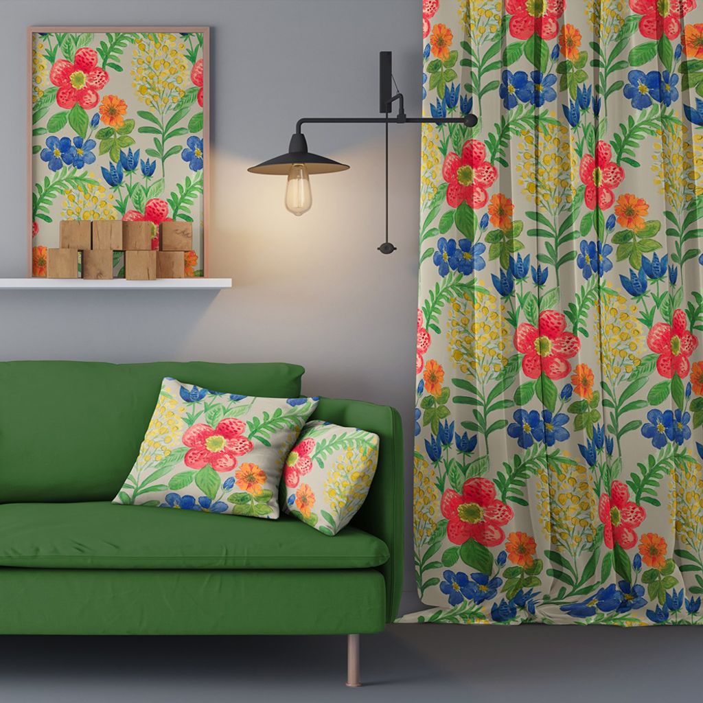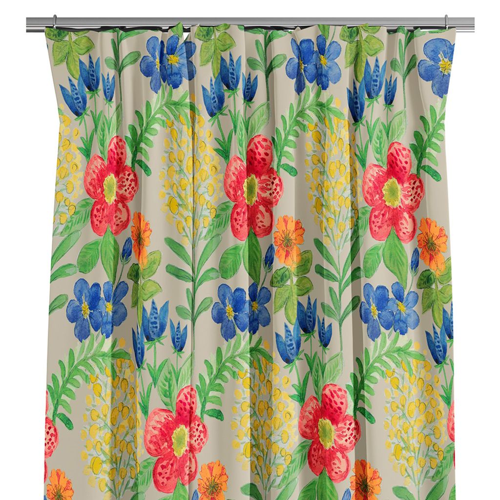 Ängsdröm beige-multi gardiner är ett levande och färgstarkt tyg med mönster likt handmålade blommor i rött, blått, gult och orange. Mjuk beige bakgrund skapas en naturlig och lekfull design som ger rummet liv och värme.