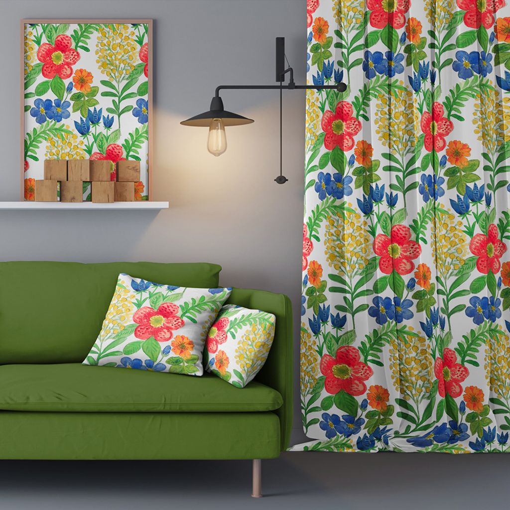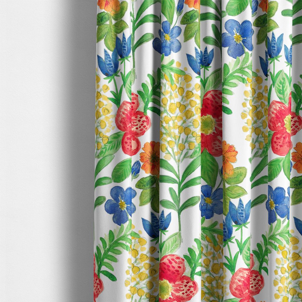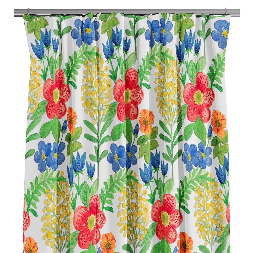 Ängsdröm offwhite-multi gardiner är ett levande och färgstarkt tyg med mönster likt handmålade blommor i rött, blått, gult och orange. Mjuk offwhite bakgrund skapas en naturlig och lekfull design som ger rummet liv och värme.