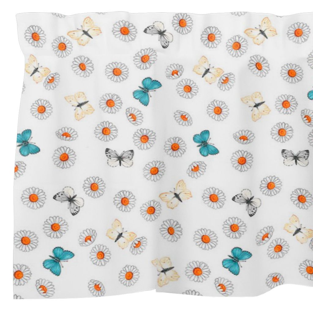 Gardinkappa på metervara med blommor och fjärilar i vitt, orange och turkost.