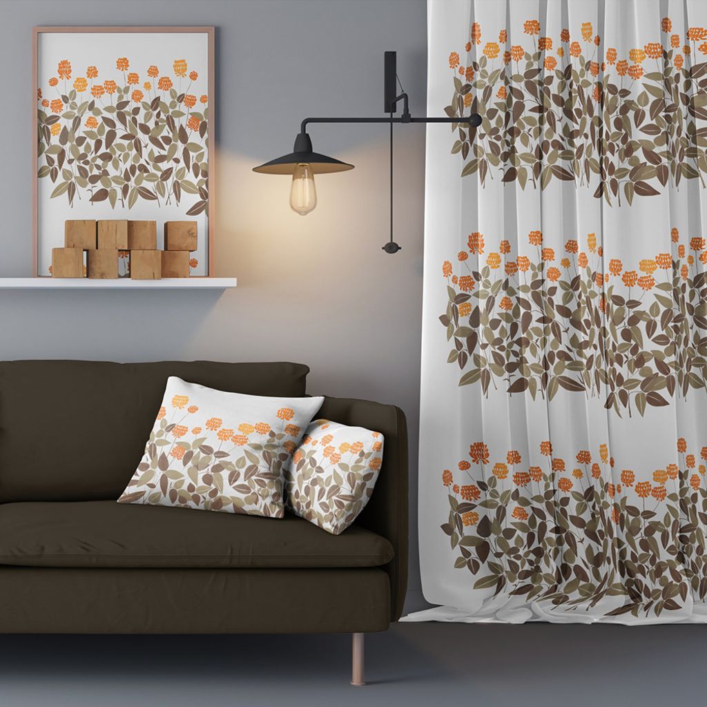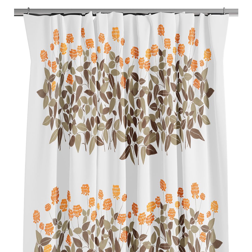 Stormönstrade gardiner med orange blommor och bruna blad på offwhite botten