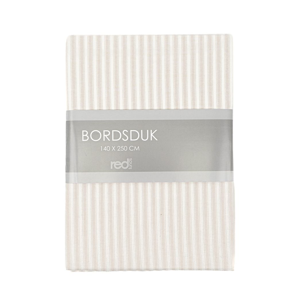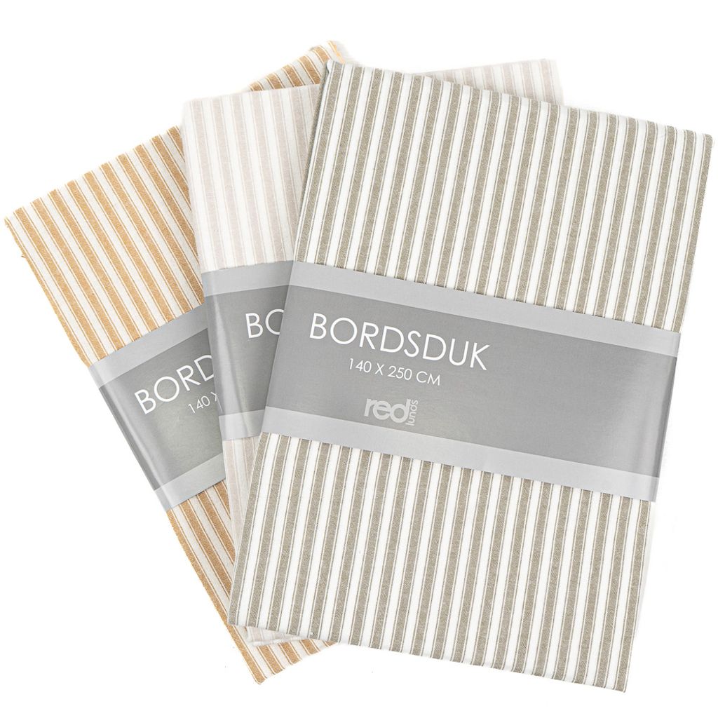Bordsduk med klassiska ränder i varm beige linneton. Passar fint till bårde vardag och fest.