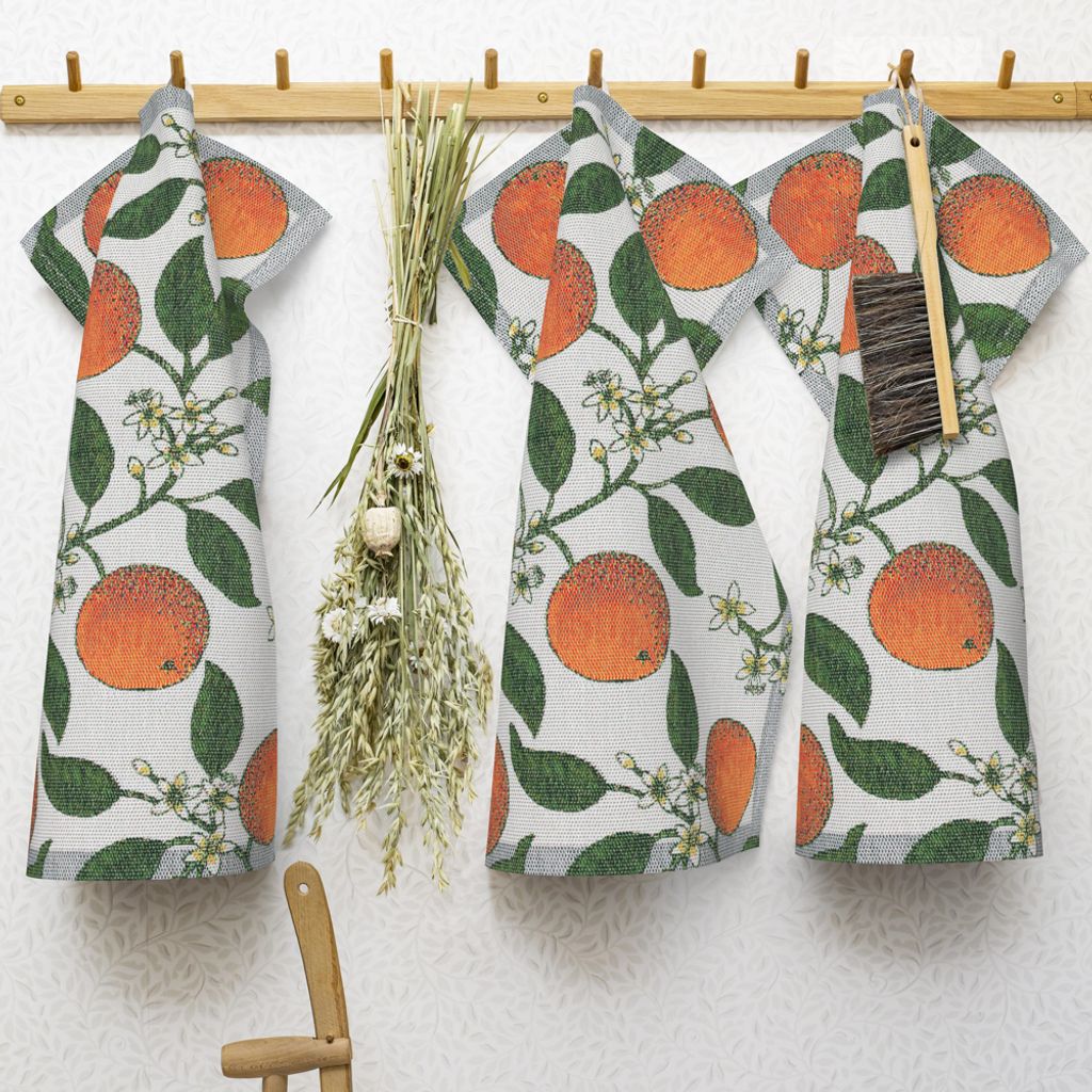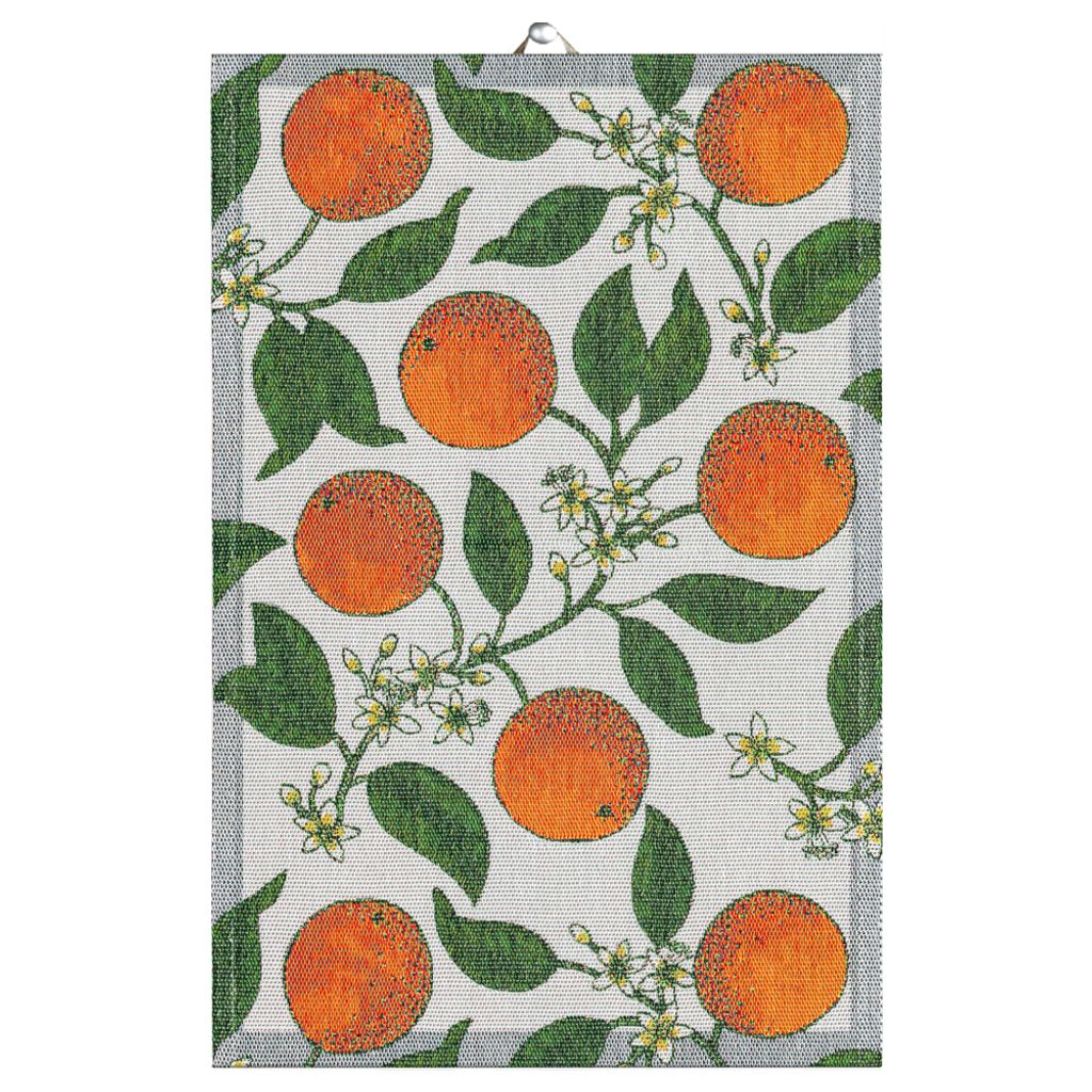 Denna livfulla handduk med apelsinmotiv, gjord av ekologiskt material och GOTS-certifierad, är en svensktillverkad pärla som lyser upp köket.