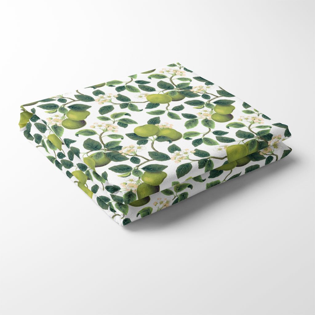 Bordsduk med tryck av gröna äpplen, vita och aprikosa små blommor på vit botten. Duken finns i 3 olika storlekar.
