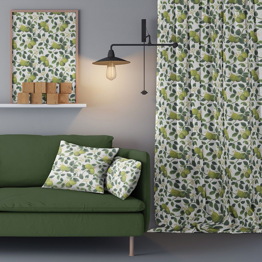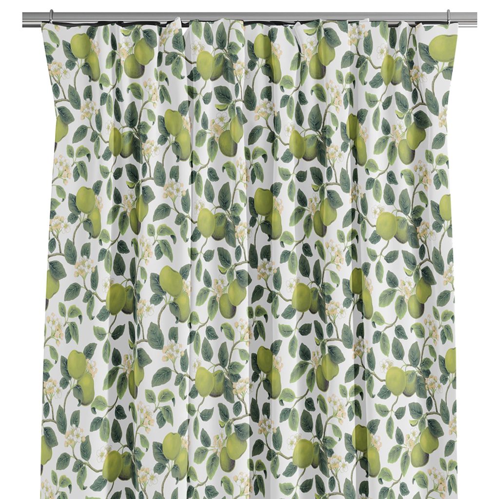 Härliga gardiner med blommande äppelkvistar och gröna äpplen.