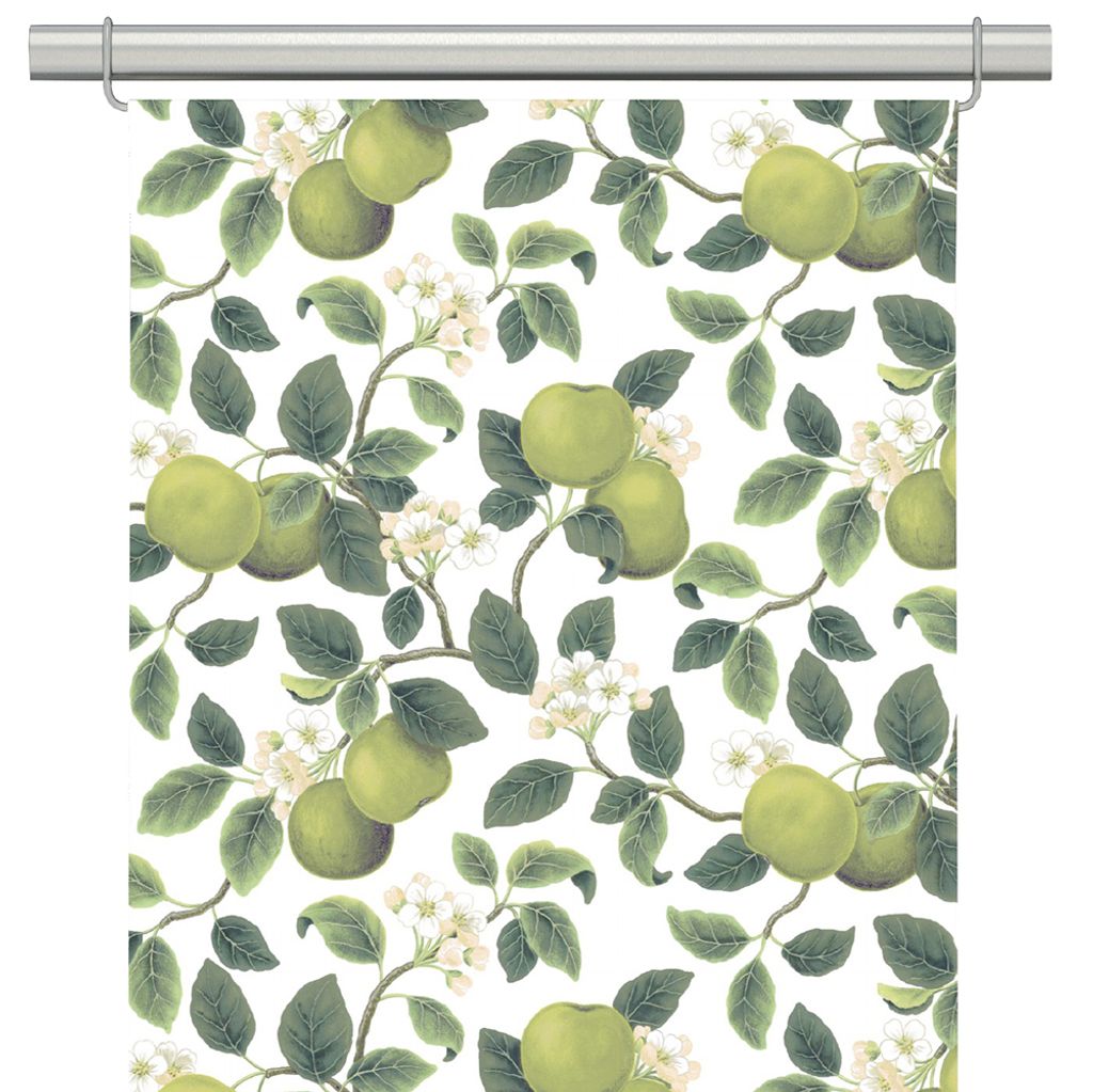 Äppellycka grön panelgardiner med äpplen och små söta blommor.
