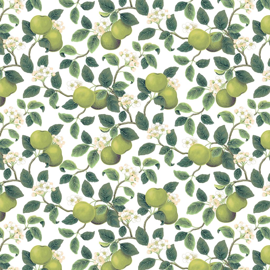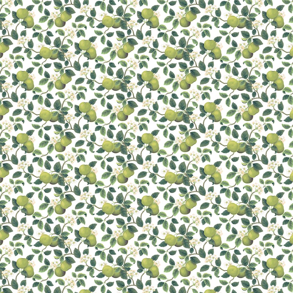 Tryck med gröna äpplen, vita och aprikosa små blommor på vit botten.