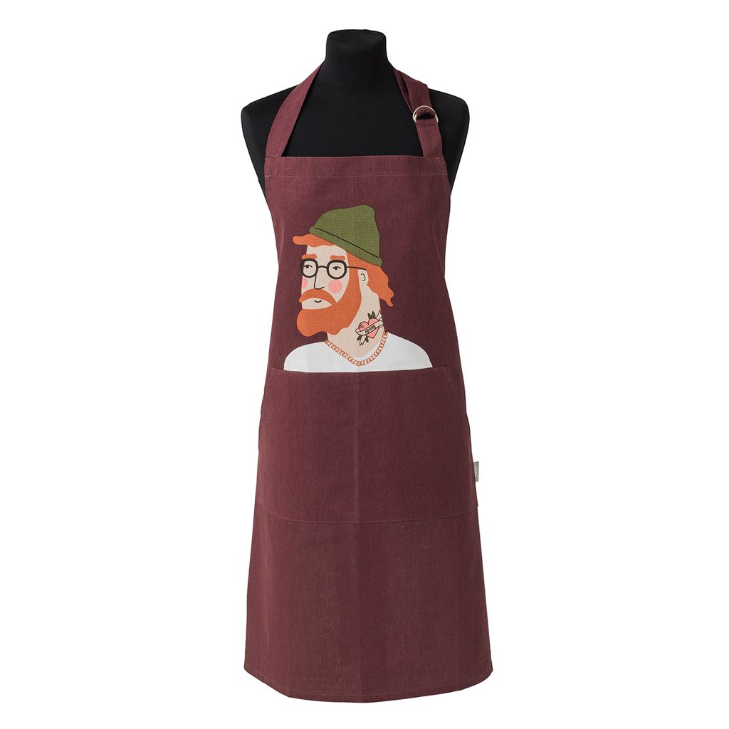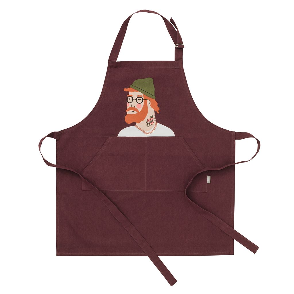 Aron kompisförkläde är en hyllning till den moderna mångsysslaren – den som kliver upp före solen, kör ett långt löppass, vinner en padelmatch och ändå har energi kvar för en kväll i köket. Med sin skogsgröna mössa, röda skägg och blommig tatuering på halsen är Aron både cool, närvarande och hjälpsam – en trogen vän i köket.
